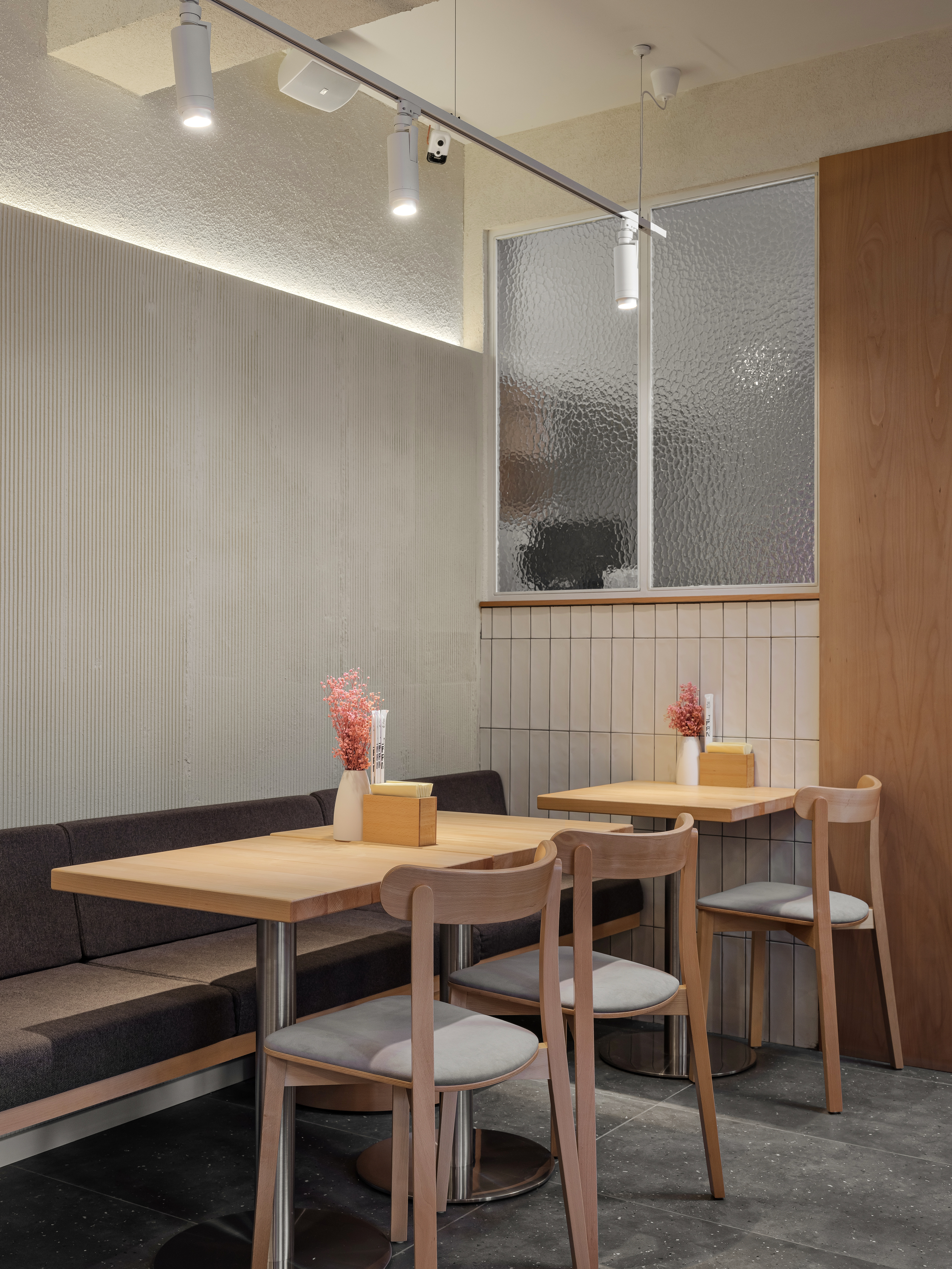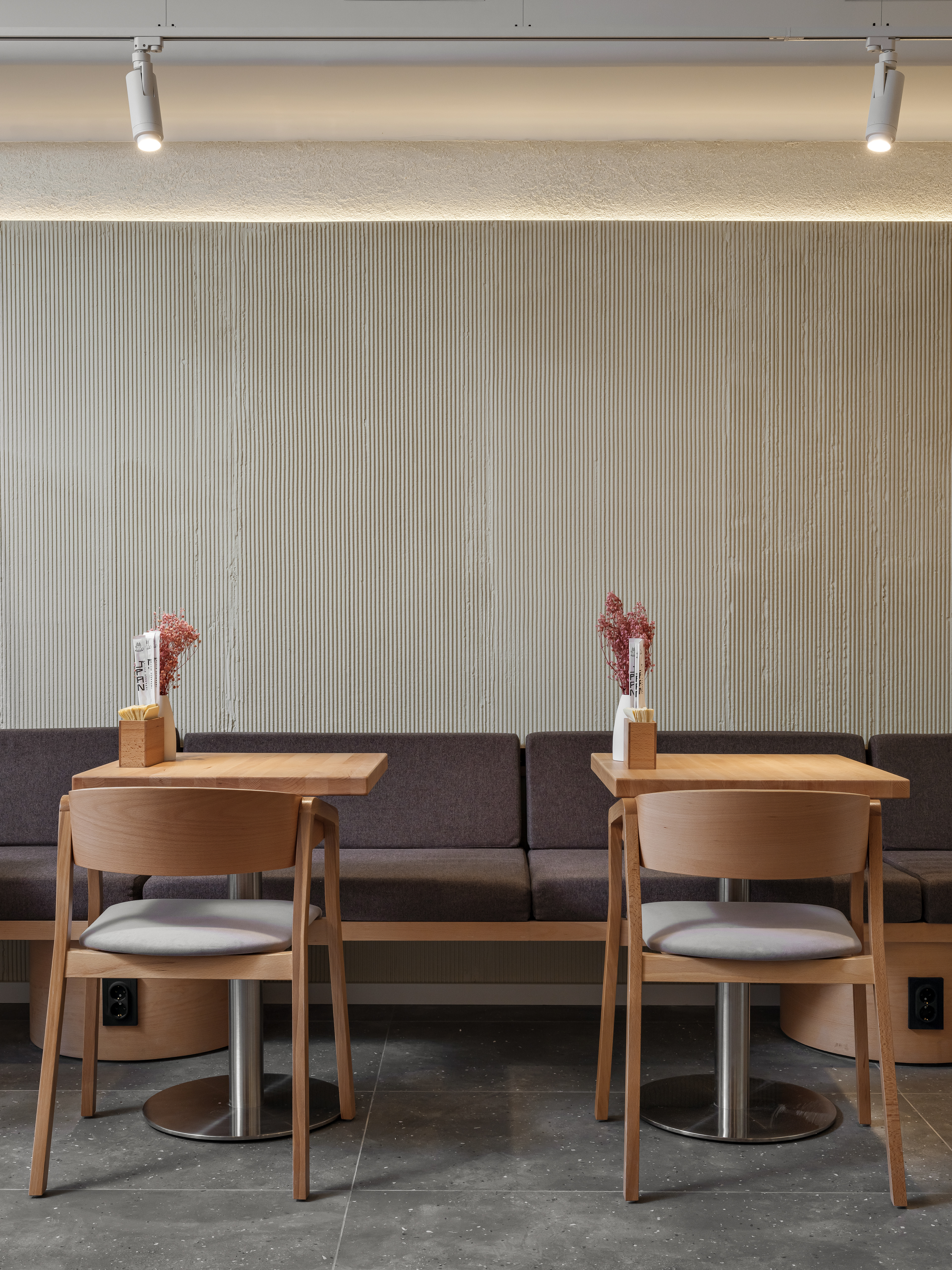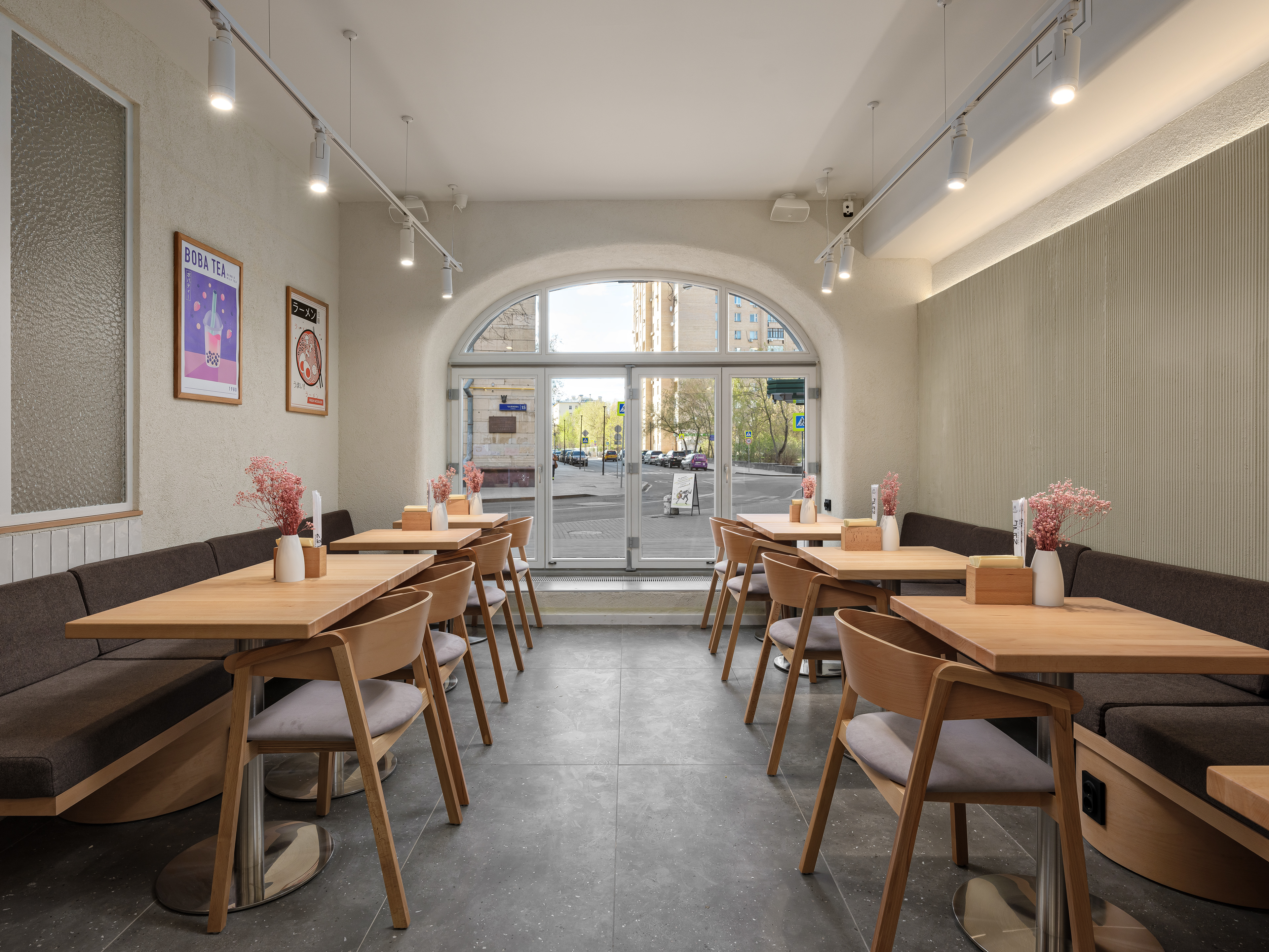 Основные материалы - рельефная штукатурка, рифлёное стекло и бук. Всё это дополняется тёплым освещением и продуманной планировкой, которая создаёт как открытые, так и более камерные зоны для гостей. Пространство получилось светлым, спокойным и очень гостеприимным - идеальным для неспешного обеда или ужина в приятной атмосфере.