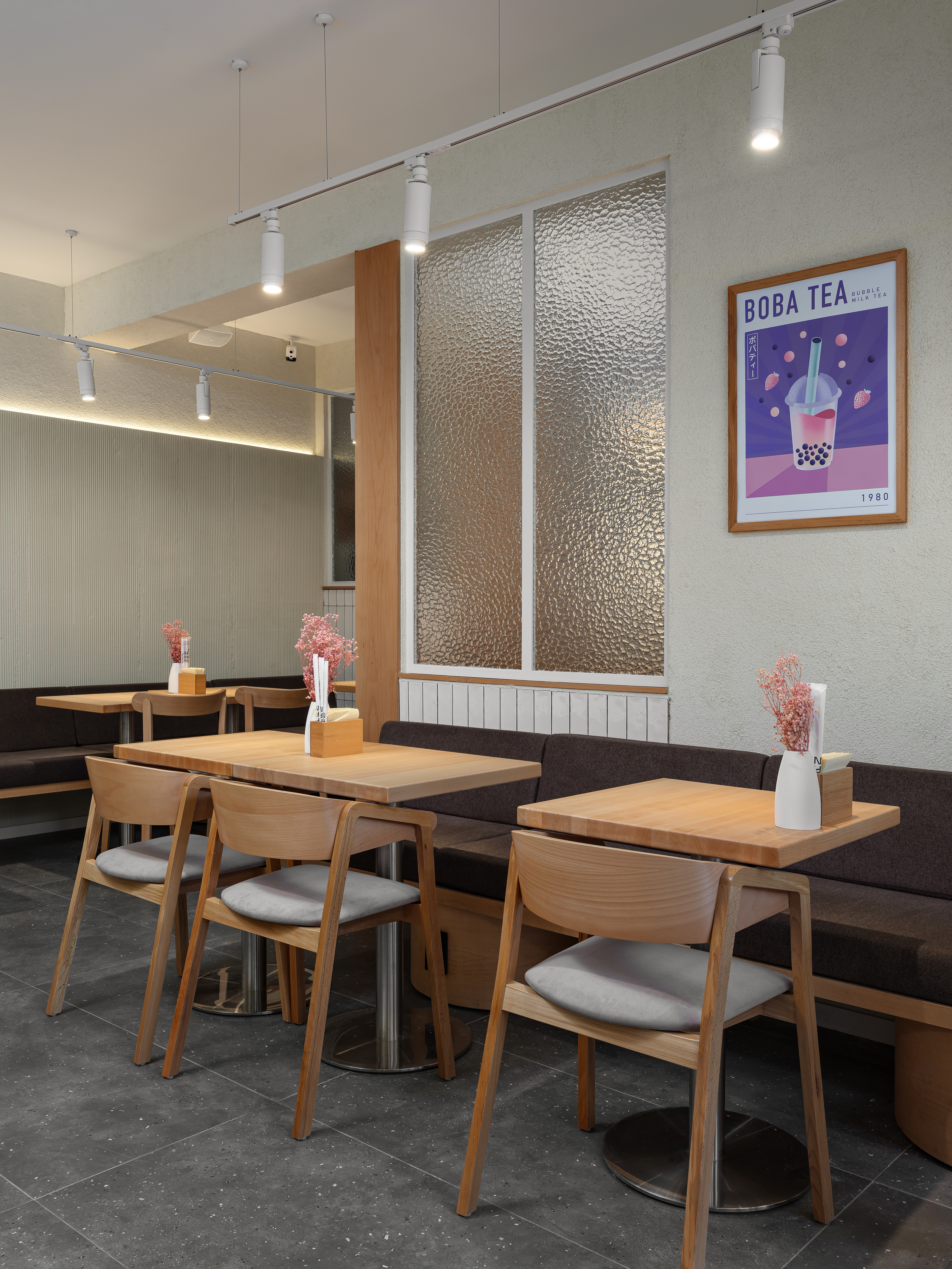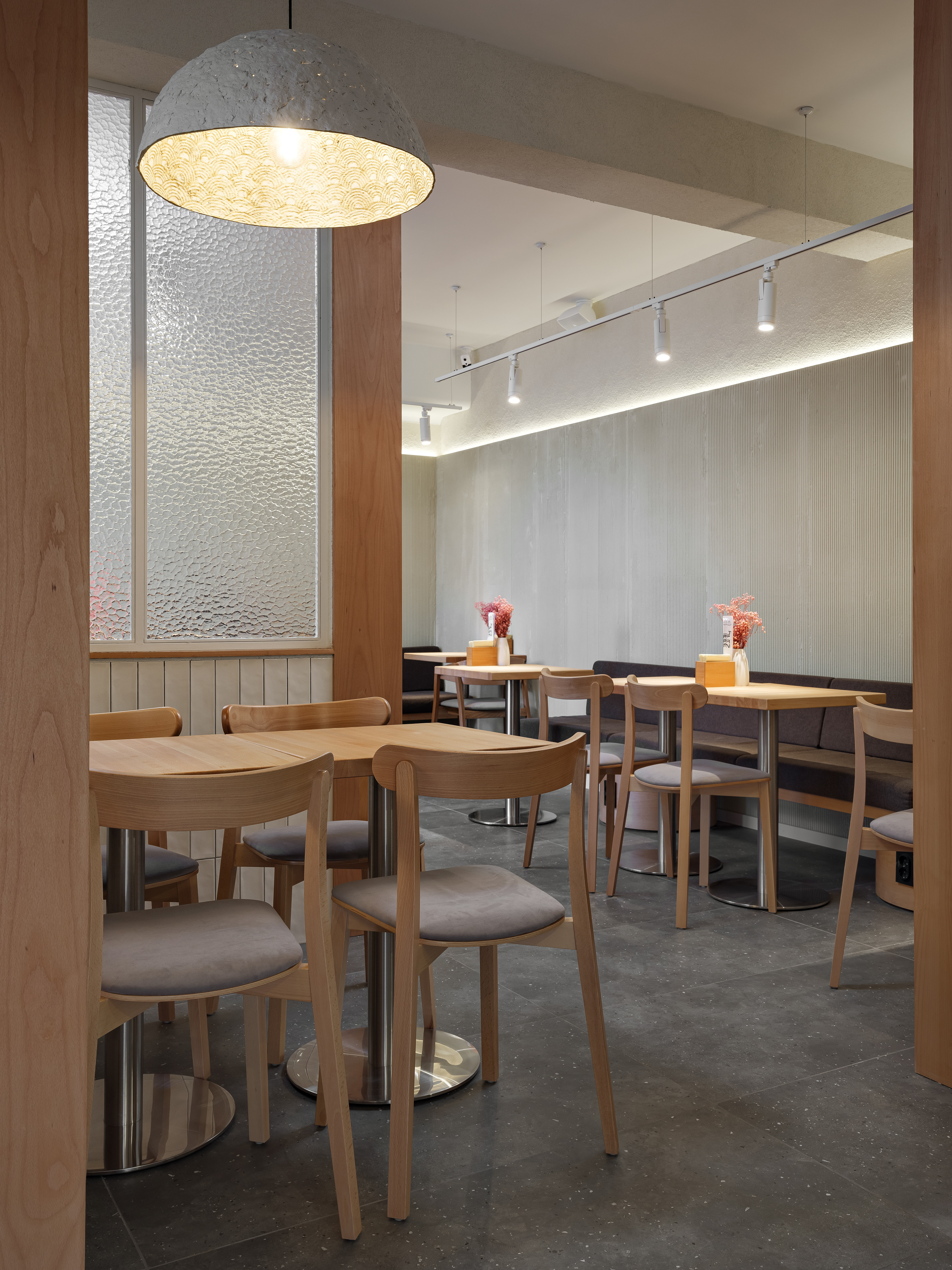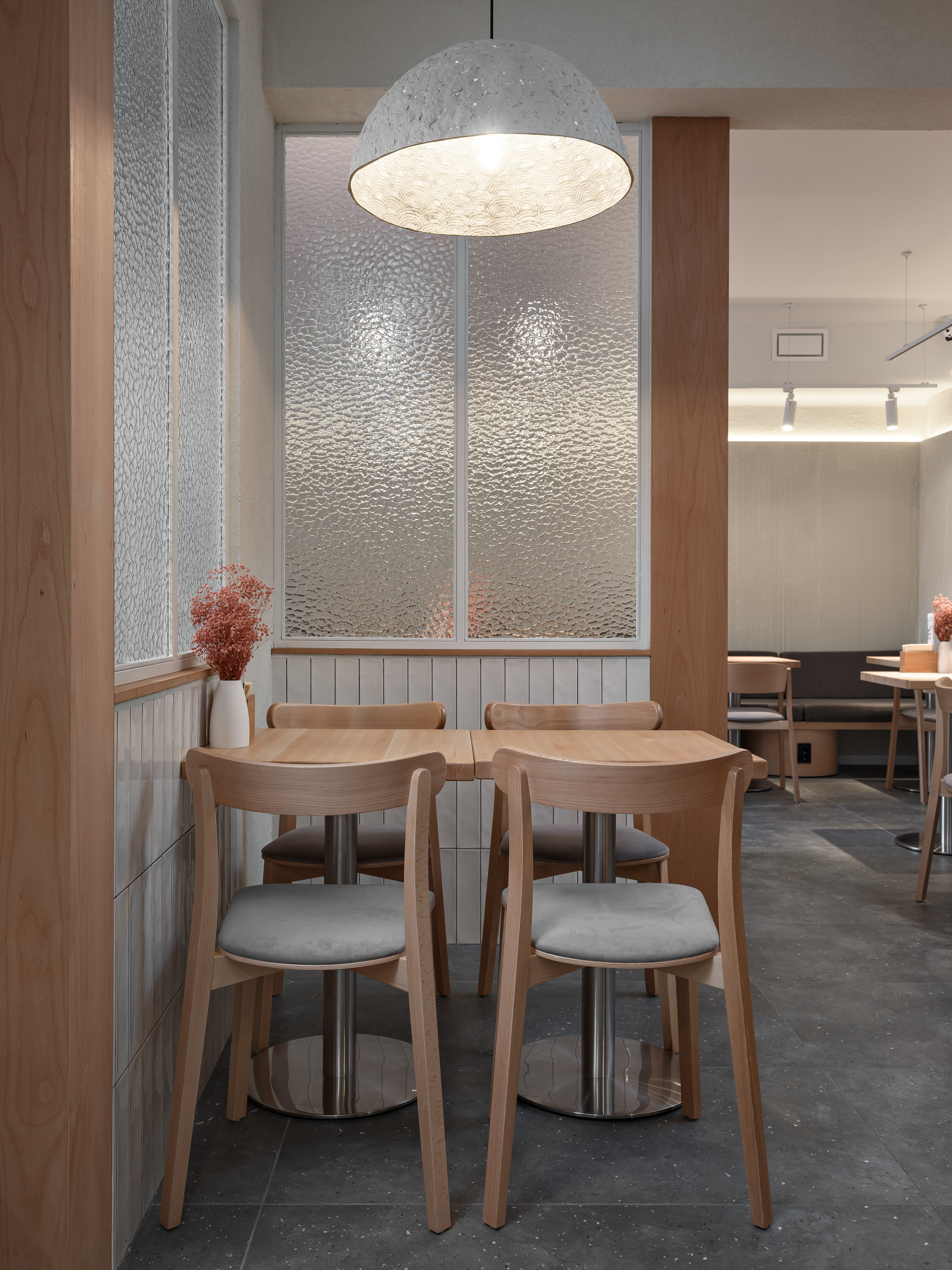 Основные материалы - рельефная штукатурка, рифлёное стекло и бук. Всё это дополняется тёплым освещением и продуманной планировкой, которая создаёт как открытые, так и более камерные зоны для гостей. Пространство получилось светлым, спокойным и очень гостеприимным - идеальным для неспешного обеда или ужина в приятной атмосфере.