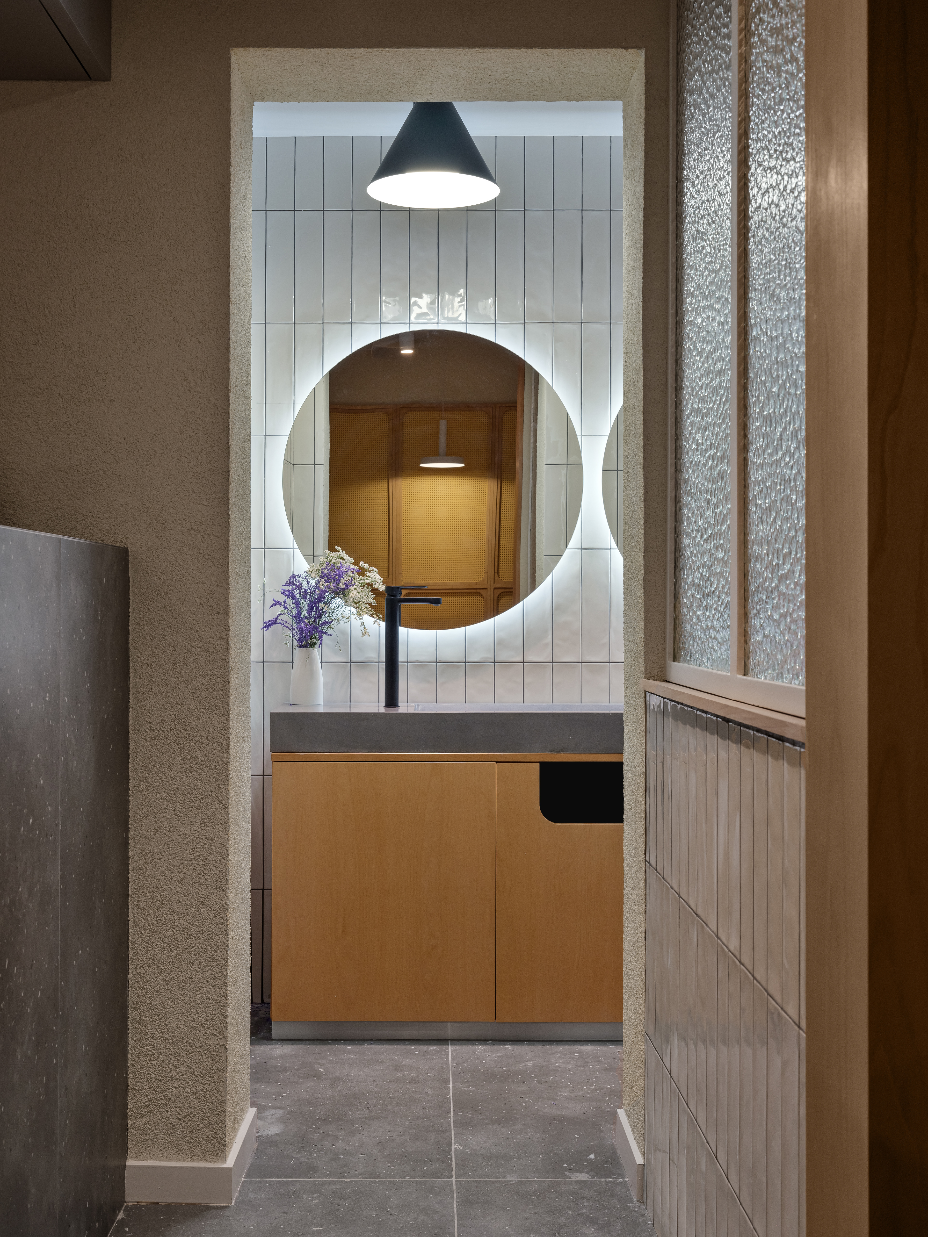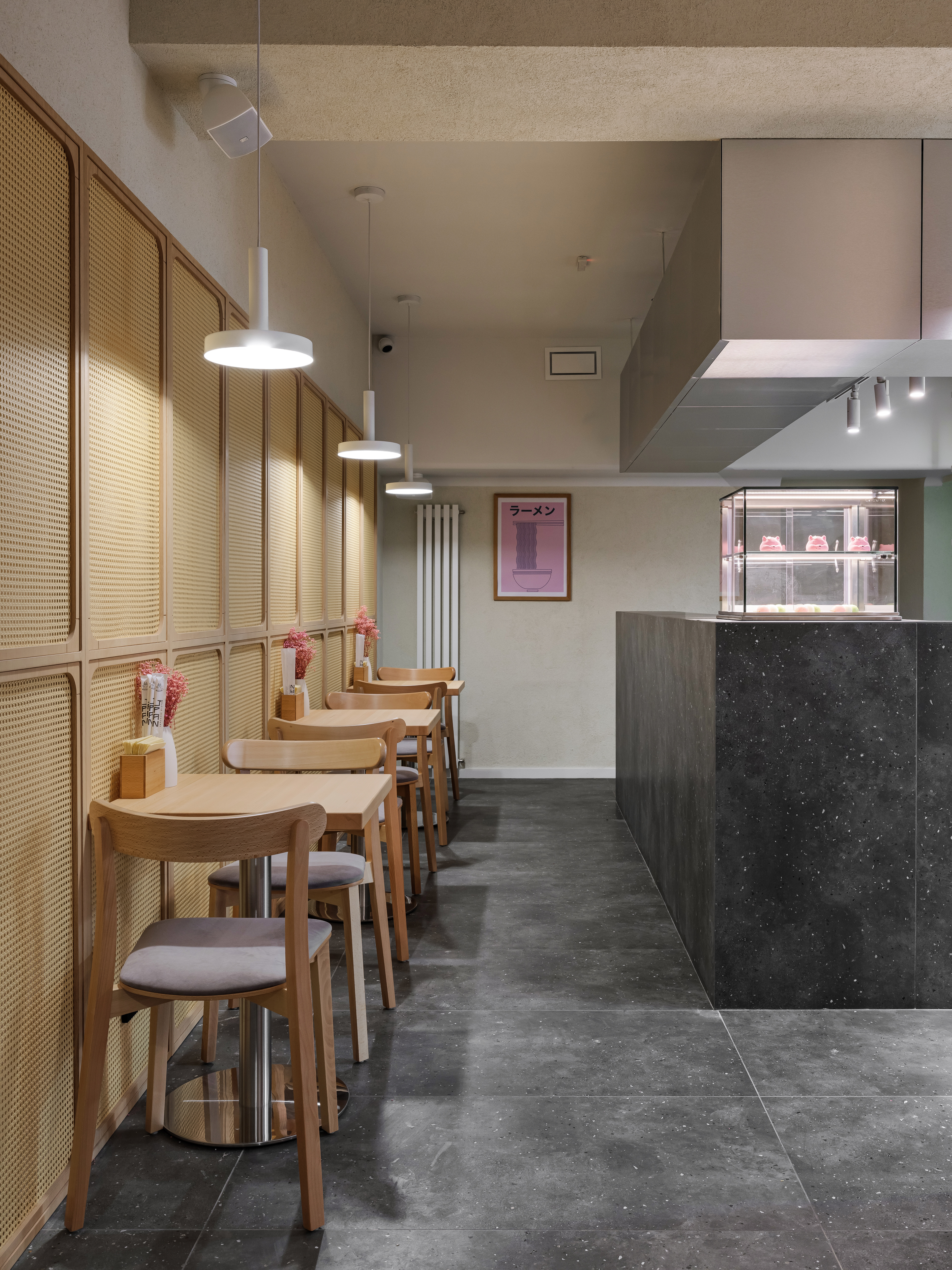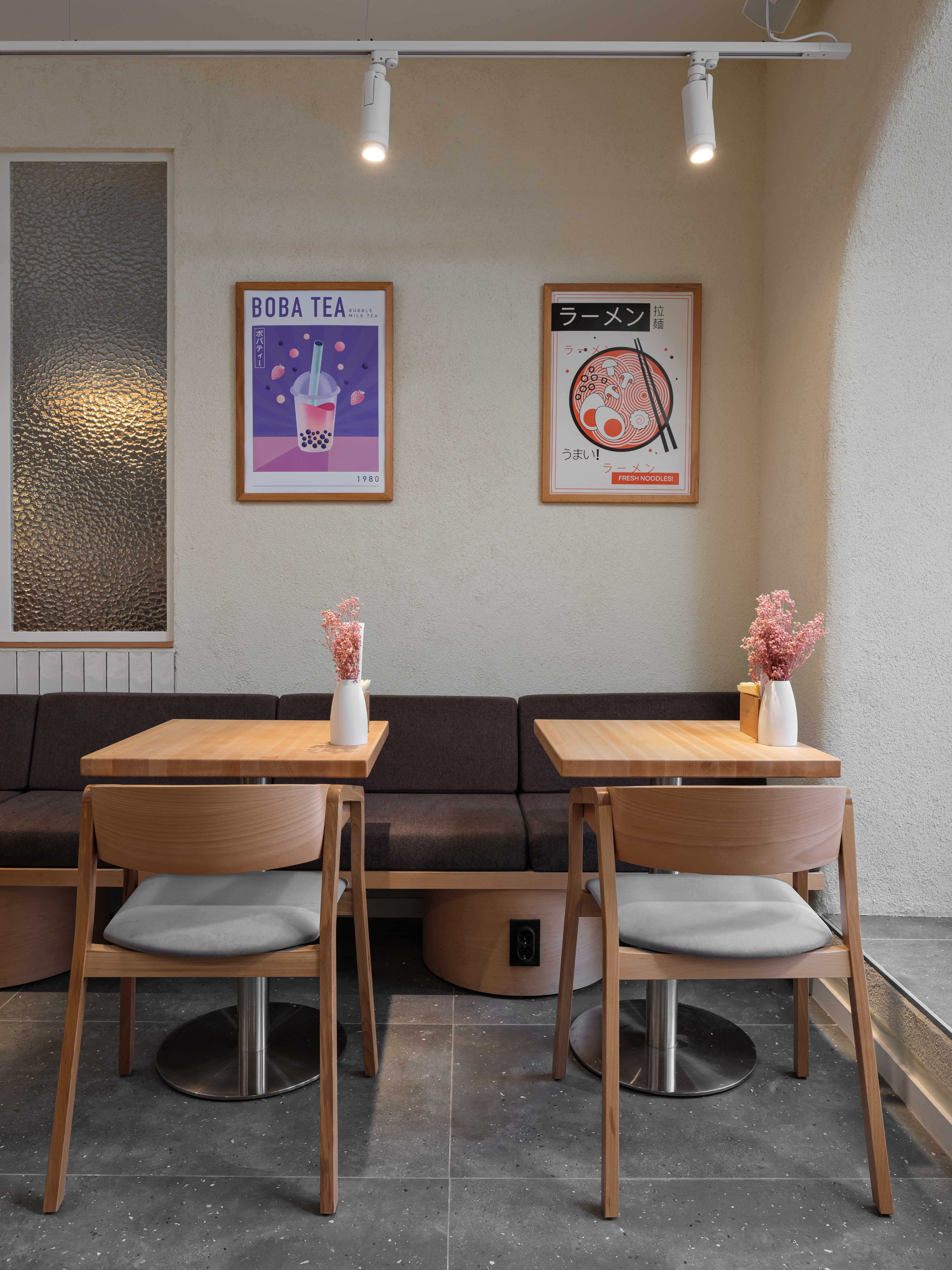 В этом проекте мы хотели создать интерьер, который отражает философию японской кухни: простоту, внимание к форме и деталям, естественность. Вместо ярких цветов и акцентов - мягкие линии, округлые формы и уютная текстура материалов. Арочные окна и двери, цилиндрические основания мебели, приглушённые тона создают ощущение уюта и спокойствия.