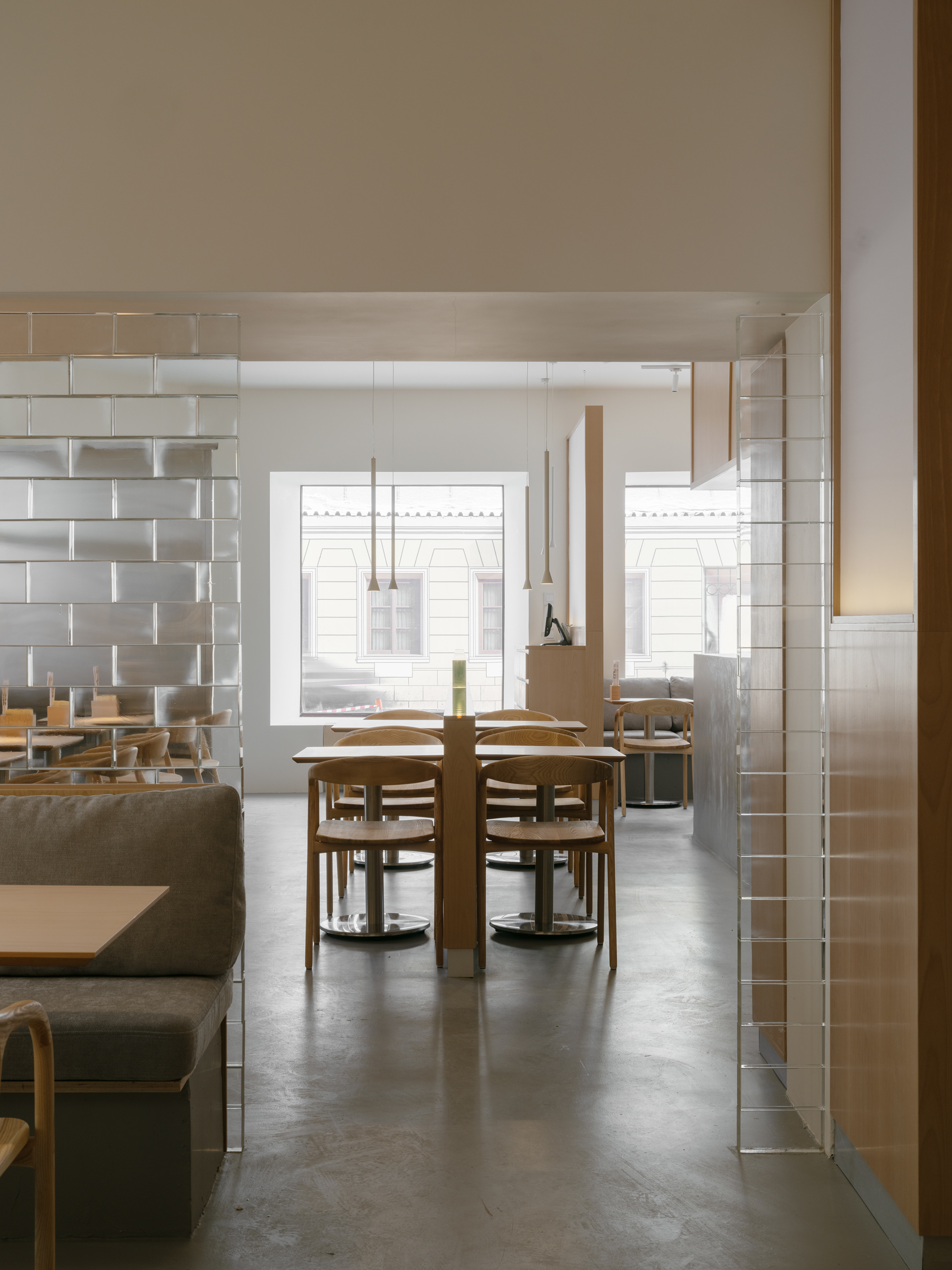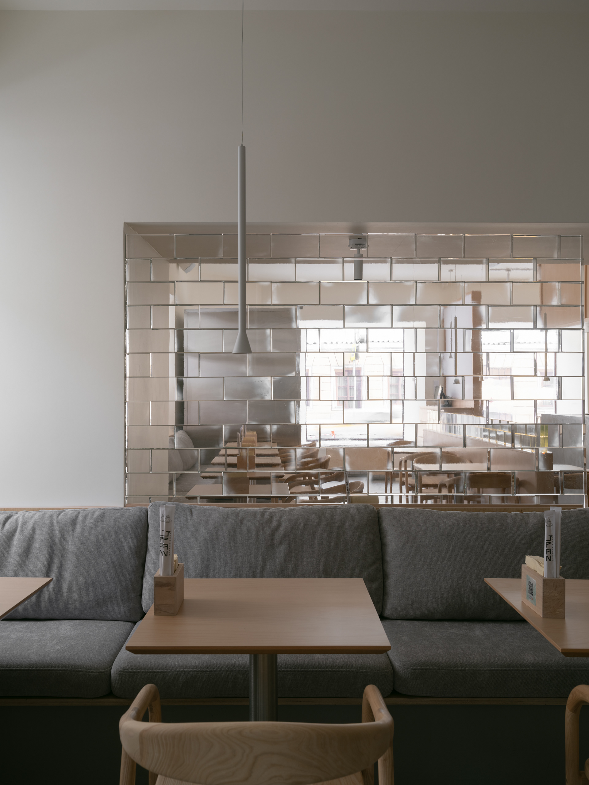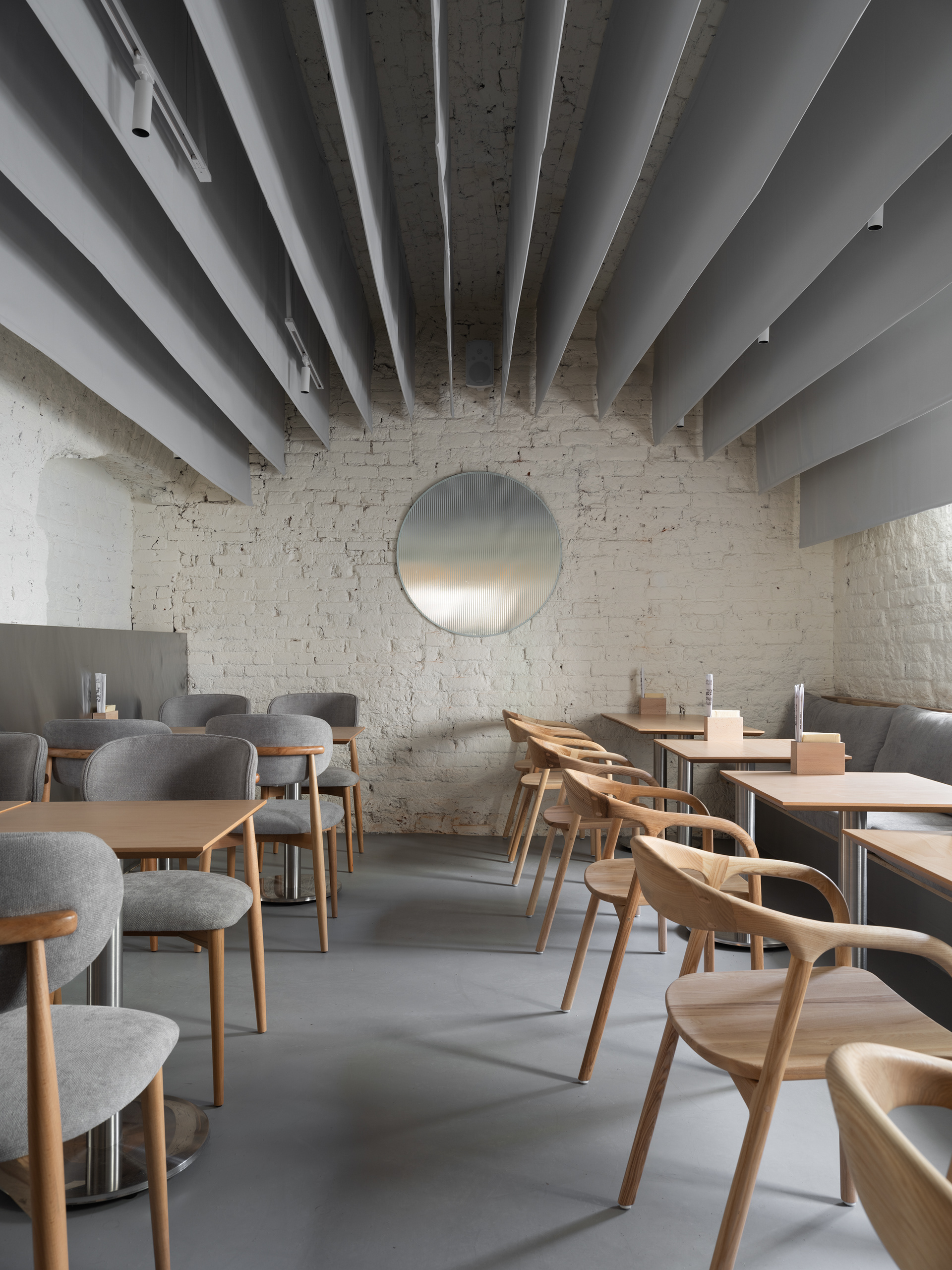В интерьере реализована тонкая отсылка к японским традиционным перегородкам седзи, выполненным из бумаги васи. В первых залах такие перегородки зонируют пространство, создавая приватность и уют, не утяжеляя интерьер. В дальней комнате они трансформируются в подвесные полотна, рифмующиеся с линией арочных потолков и подчёркивающие их архитектурную выразительность.