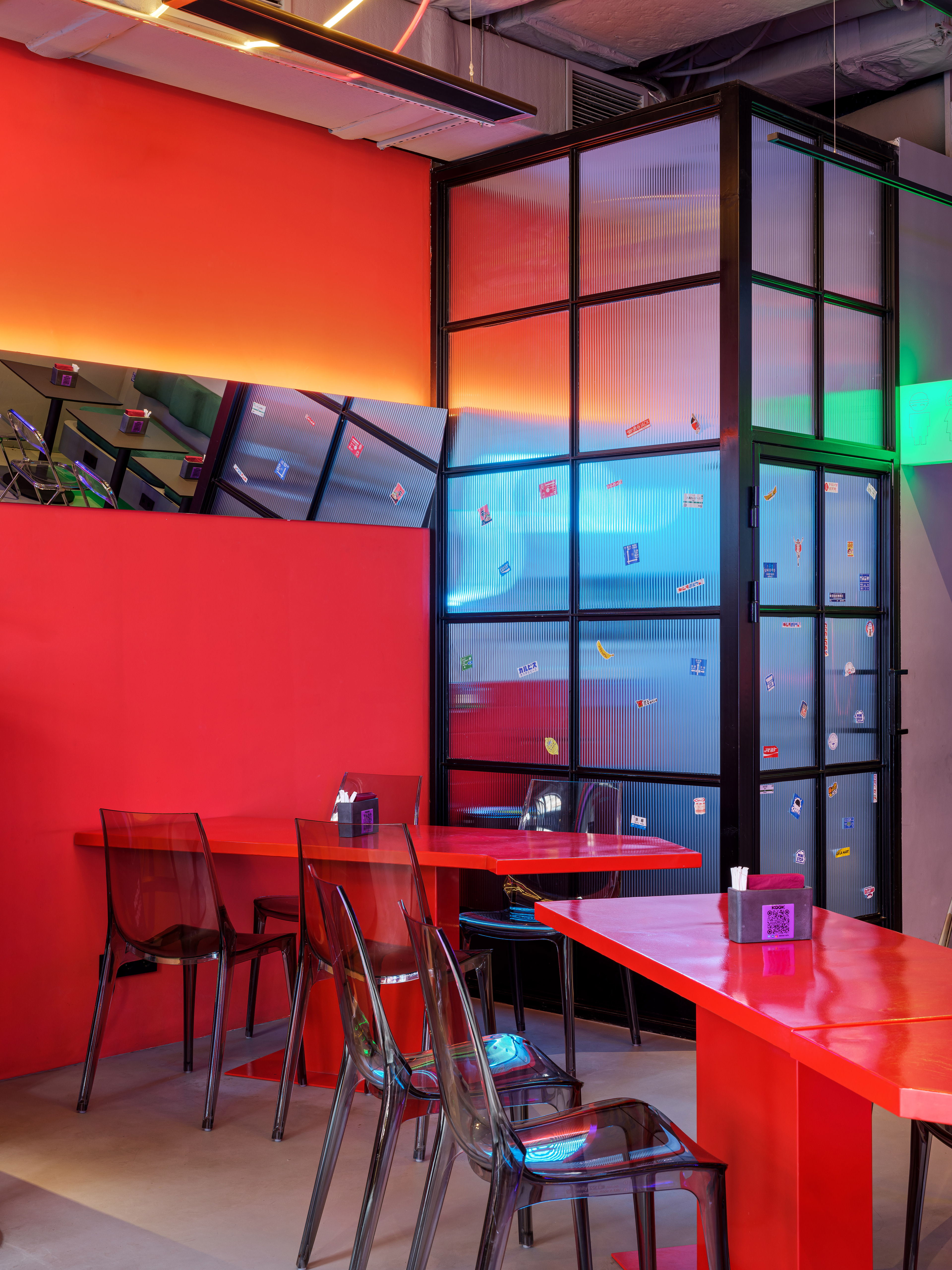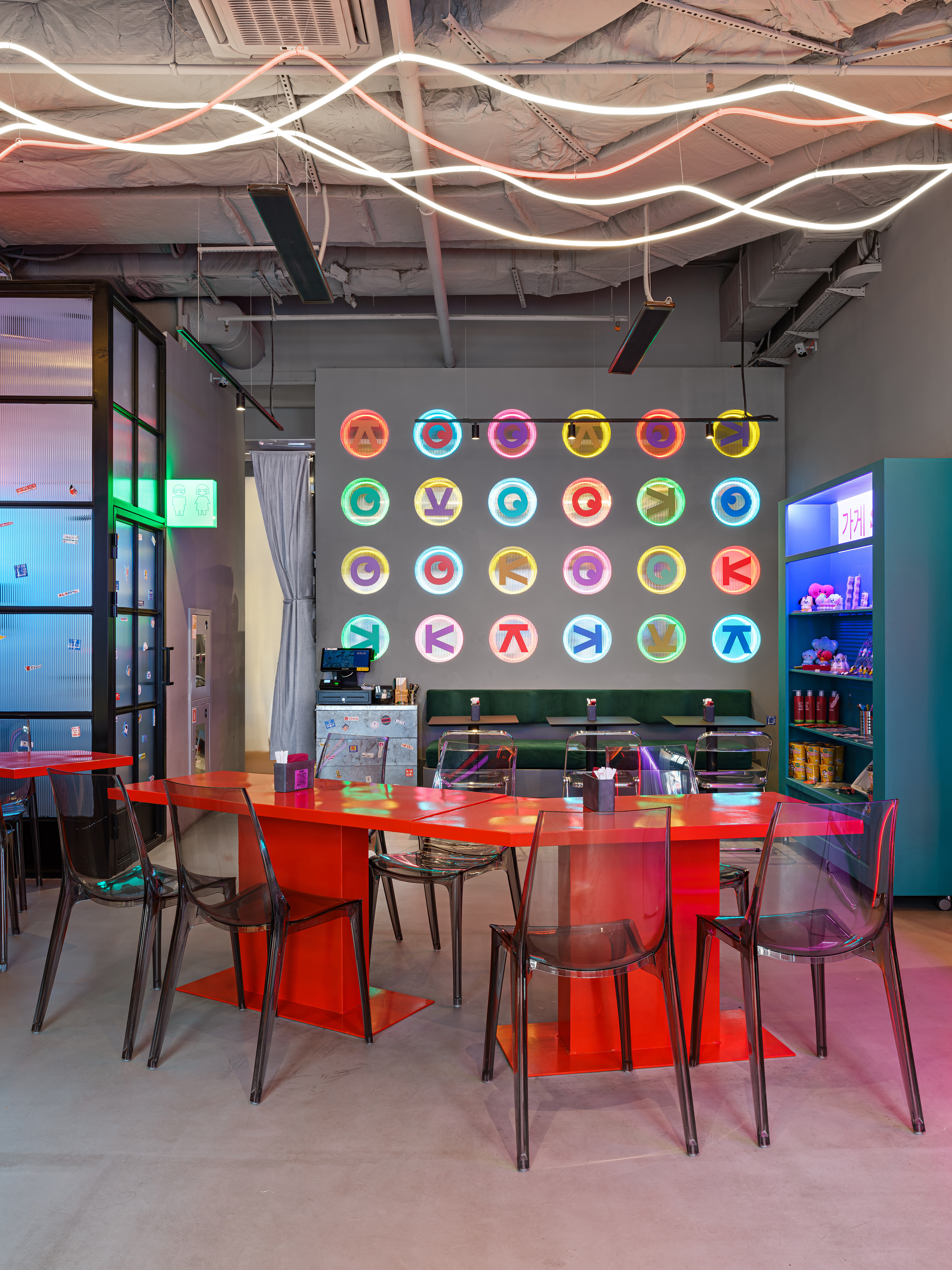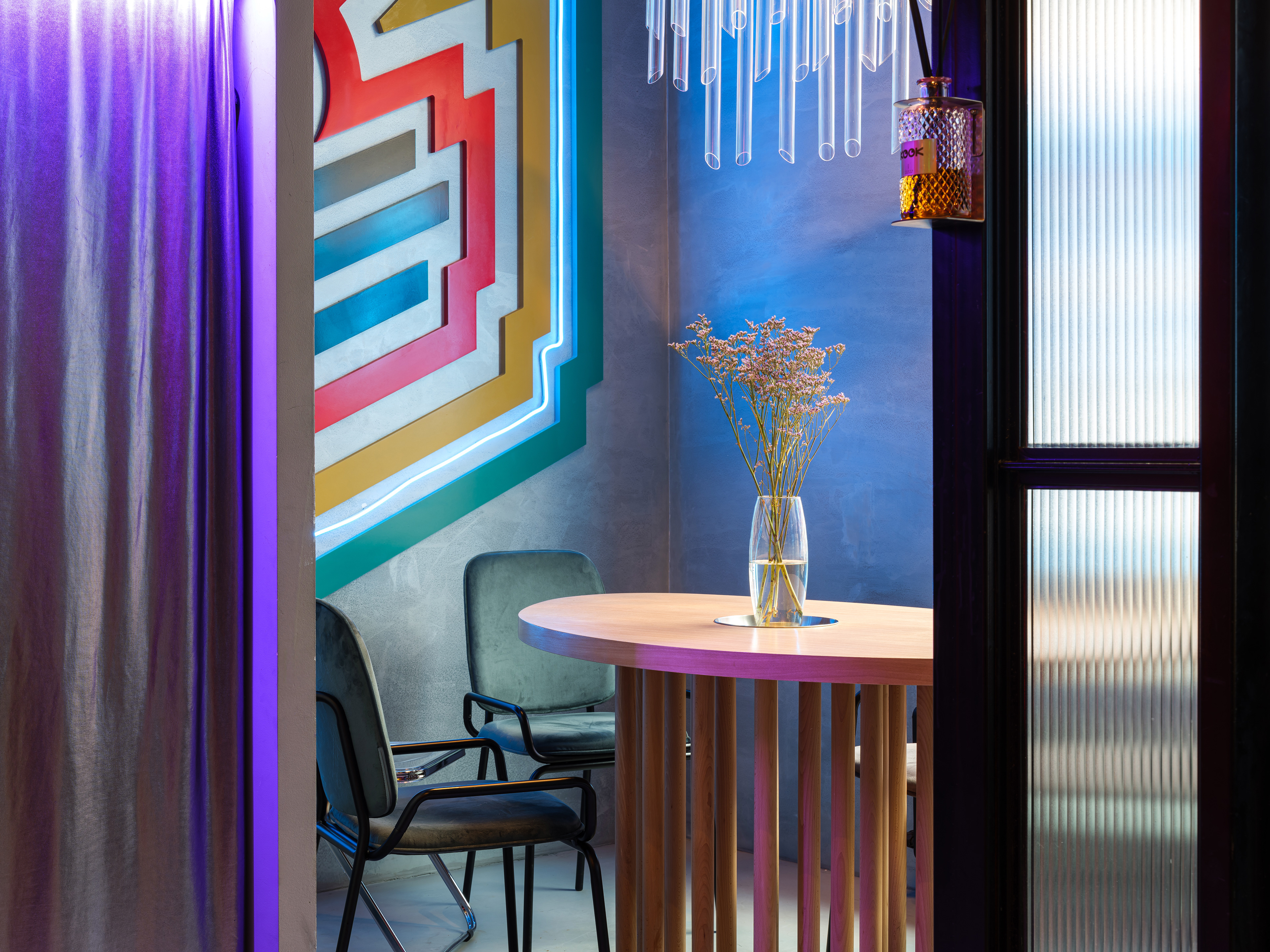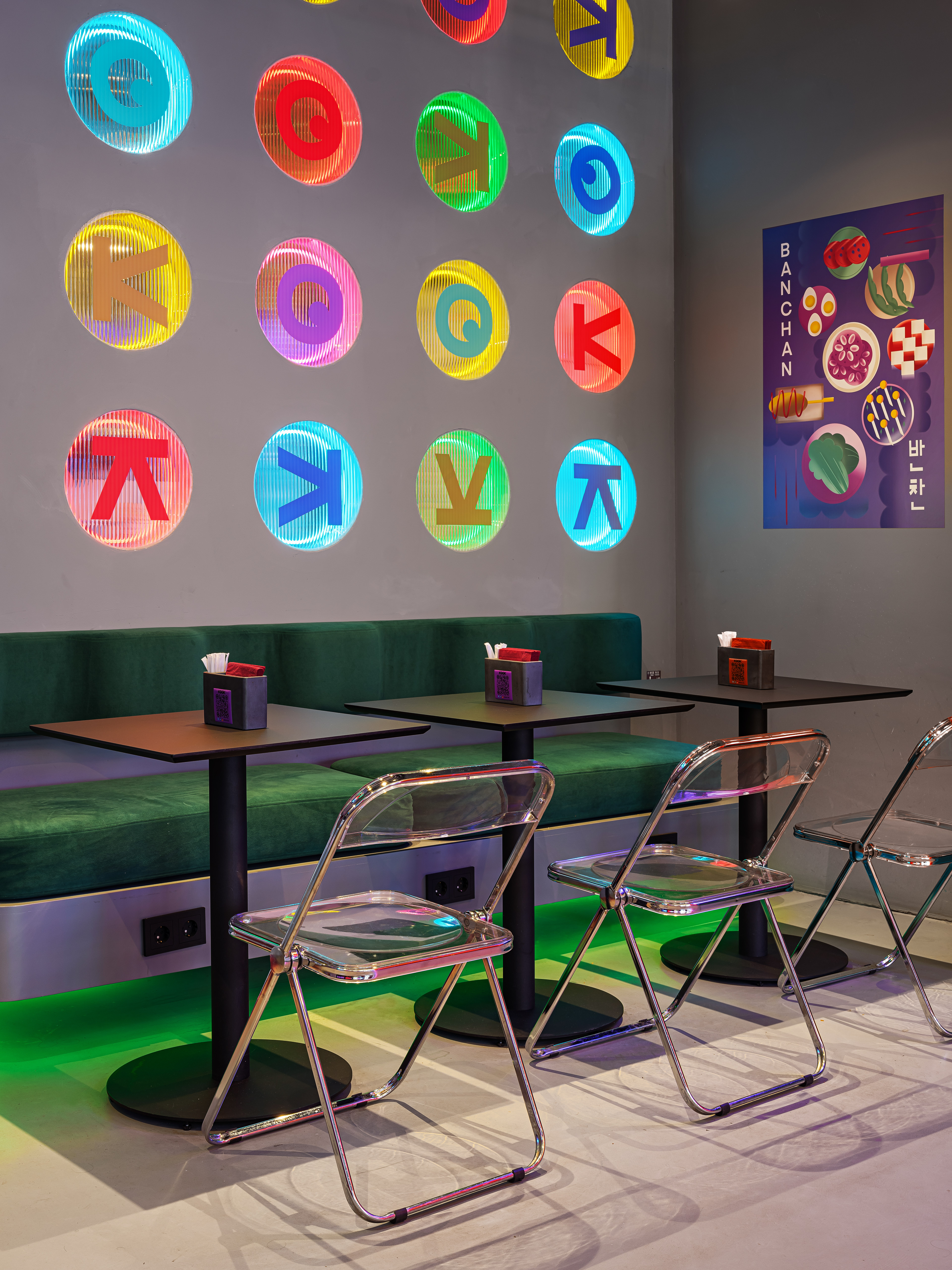 At the heart of the interior lies a wall adorned with 24 circular, backlit windows, peering into the kitchen below. These windows boast the signature colors of the Kook brand, adding a touch of whimsy to the floating bench beneath. Executing this intricate feature was a challenge, but under our watchful eyes, the construction team brought it to life exactly as we envisioned. Nearly everything in the venue is custom-made based on individual blueprints, from panels mimicking a recording studio to the "wet floor" sign.