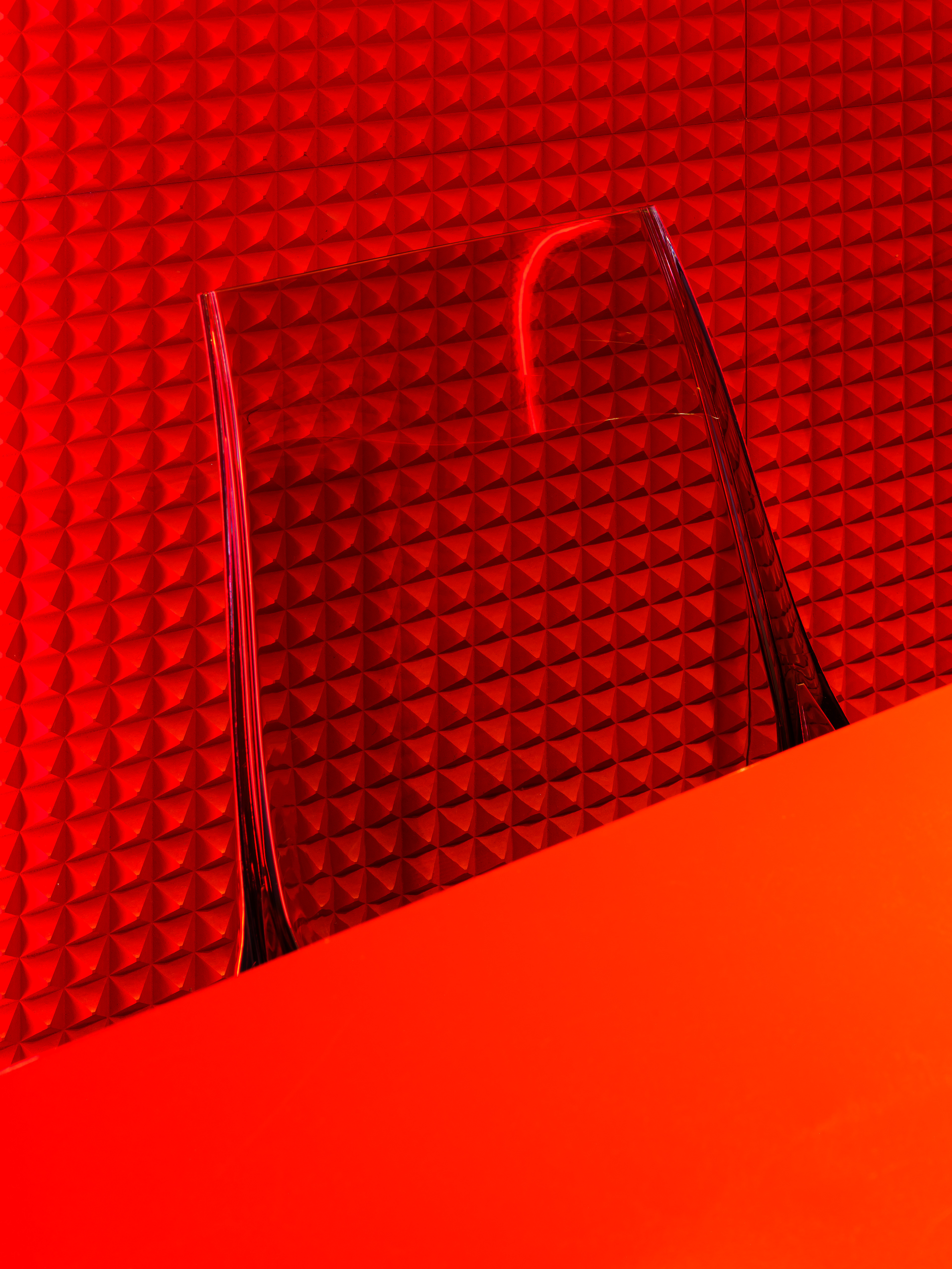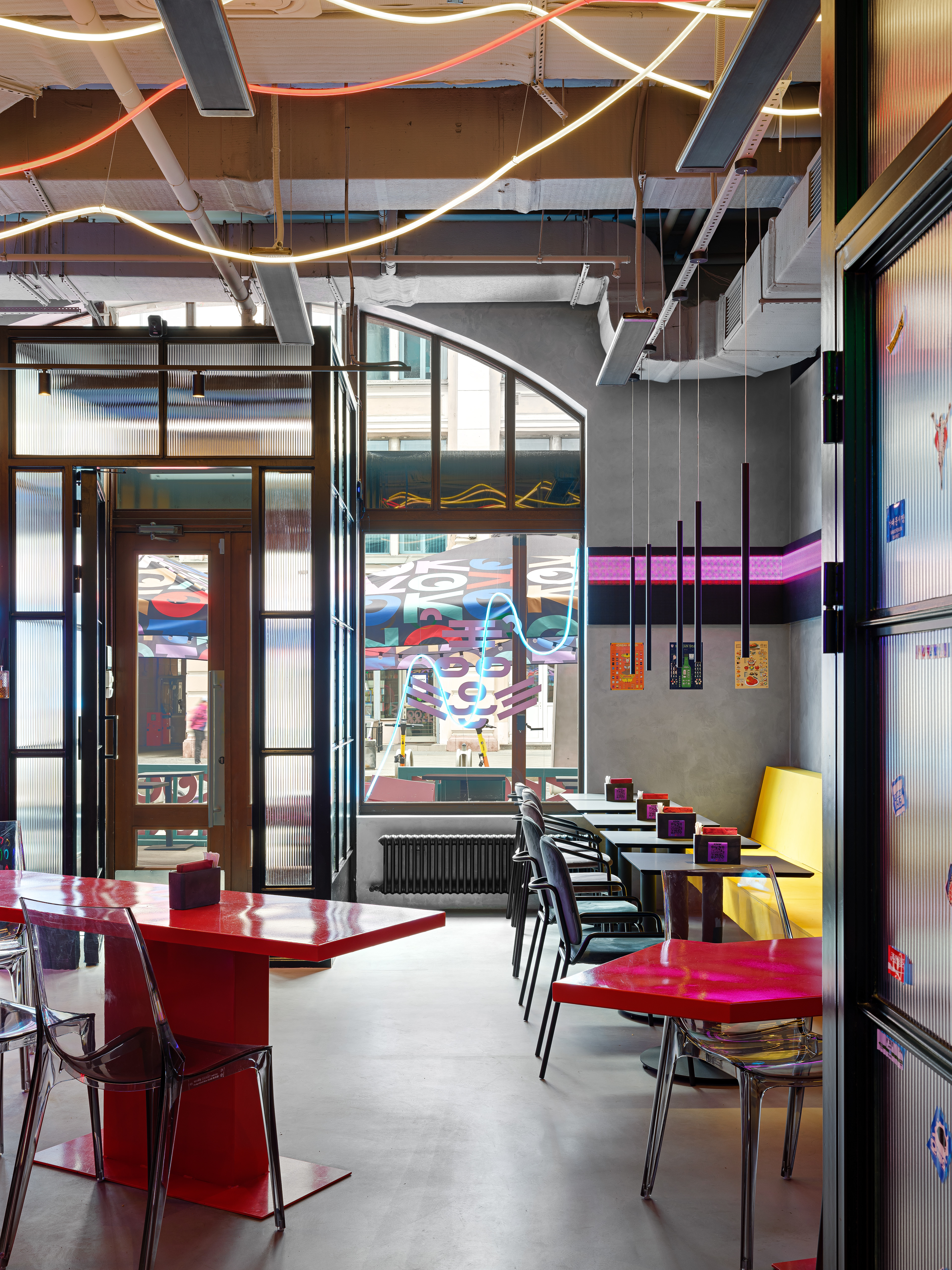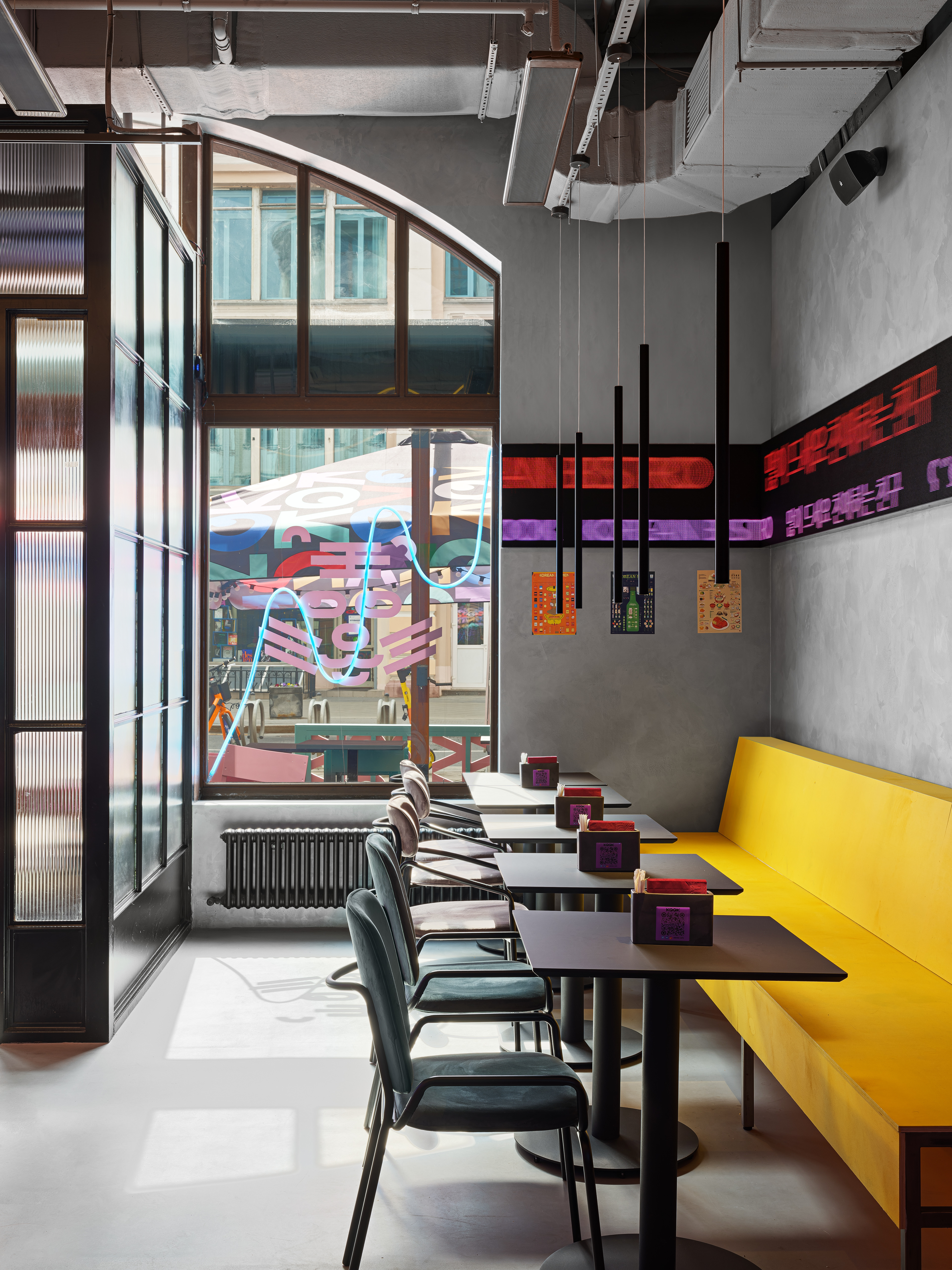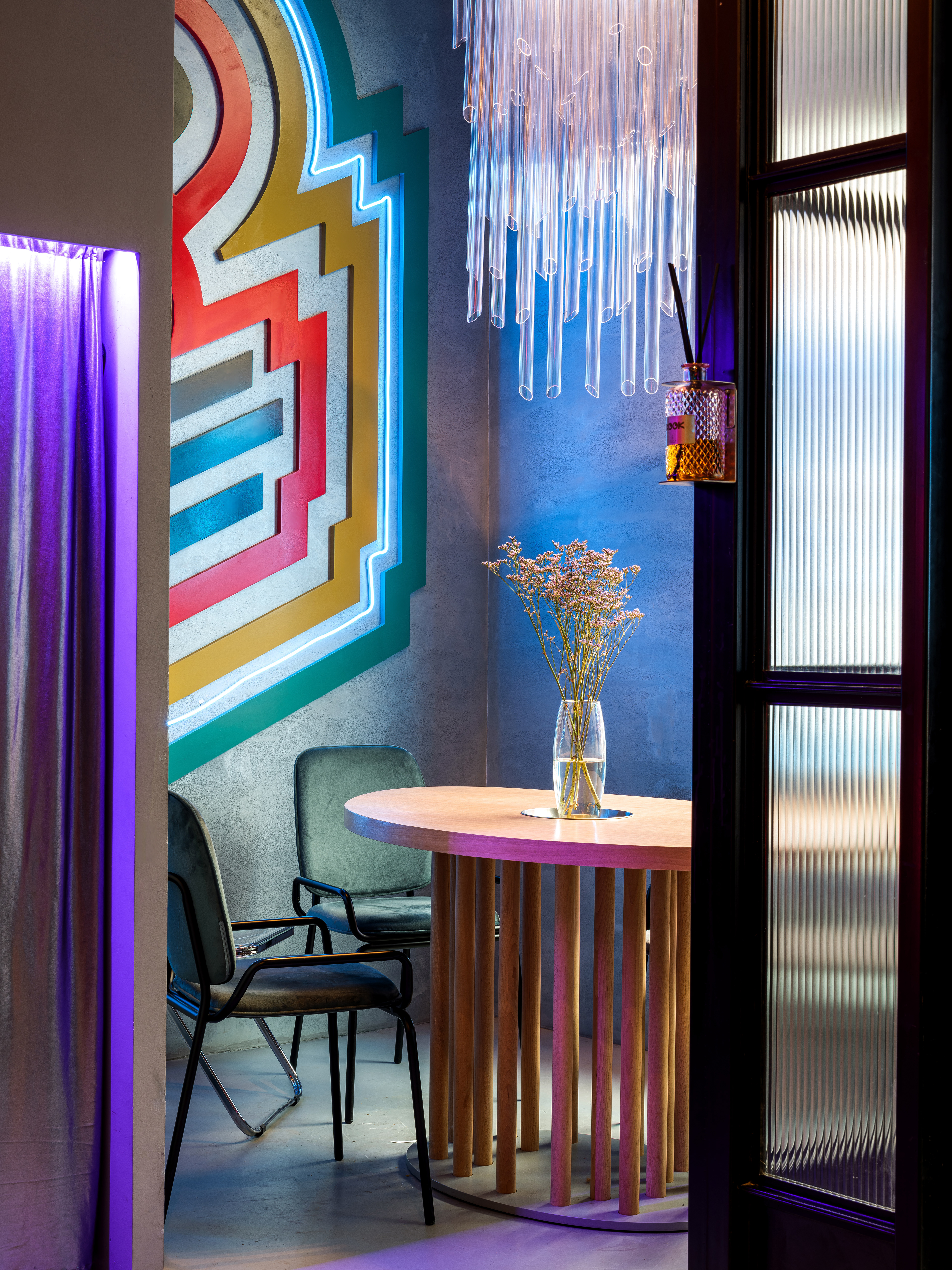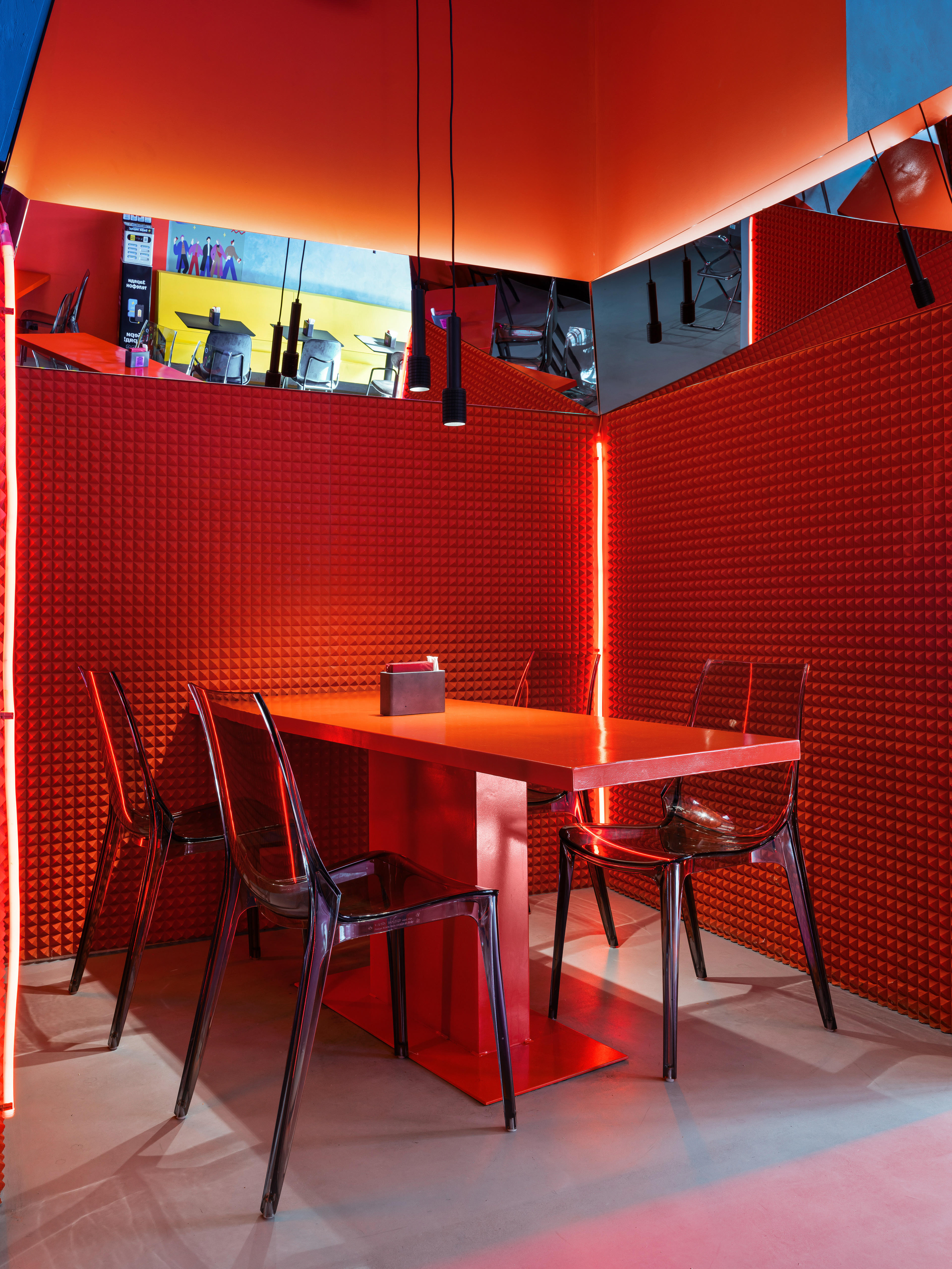 At the heart of the interior lies a wall adorned with 24 circular, backlit windows, peering into the kitchen below. These windows boast the signature colors of the Kook brand, adding a touch of whimsy to the floating bench beneath. Executing this intricate feature was a challenge, but under our watchful eyes, the construction team brought it to life exactly as we envisioned. Nearly everything in the venue is custom-made based on individual blueprints, from panels mimicking a recording studio to the "wet floor" sign.