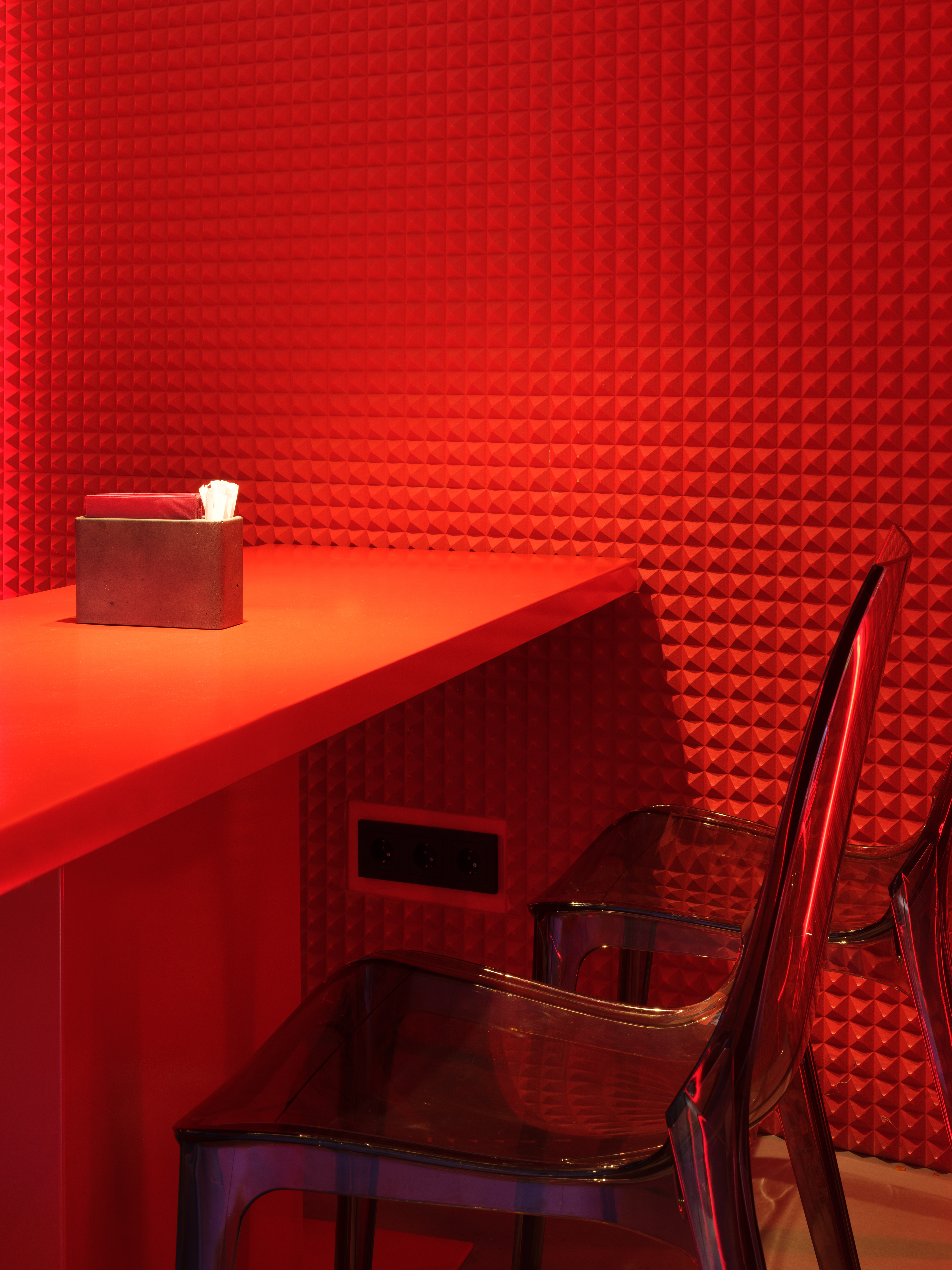 Ядро интерьера - стена с 24 круглыми сквозными окошками, выходящими на кухню со встроенными подсветками фирменных цветов бренда Kook, под которыми расположилась парящая лавка. Это сложный в реализации элемент, но команда строителей под нашим надзором исполнила его ровно так, как мы задумали. На объекте практически все изготовлено на заказ по индивидуальным чертежам - от панелей, имитирующих студию звукозаписи, до таблички мокрый пол.