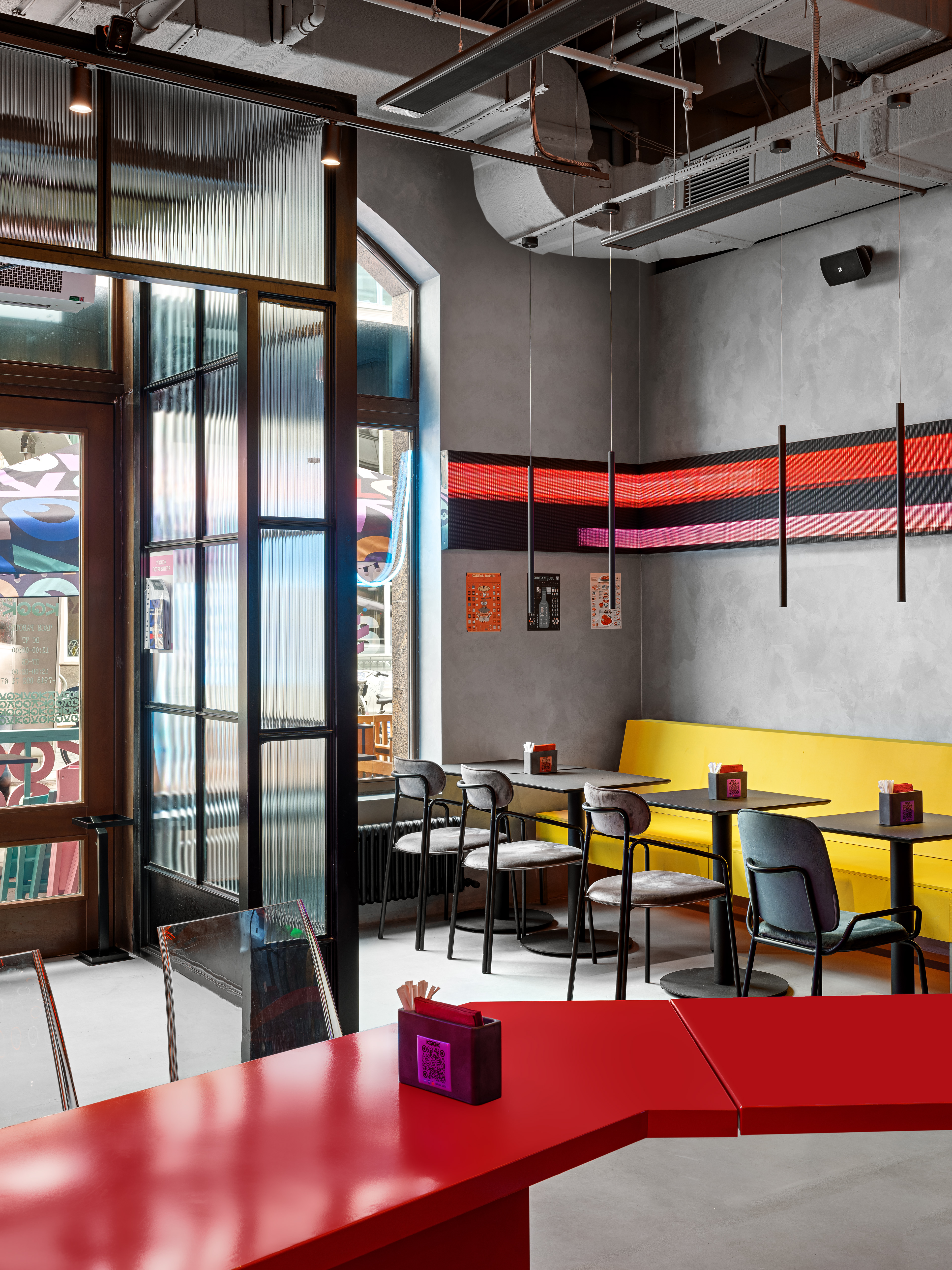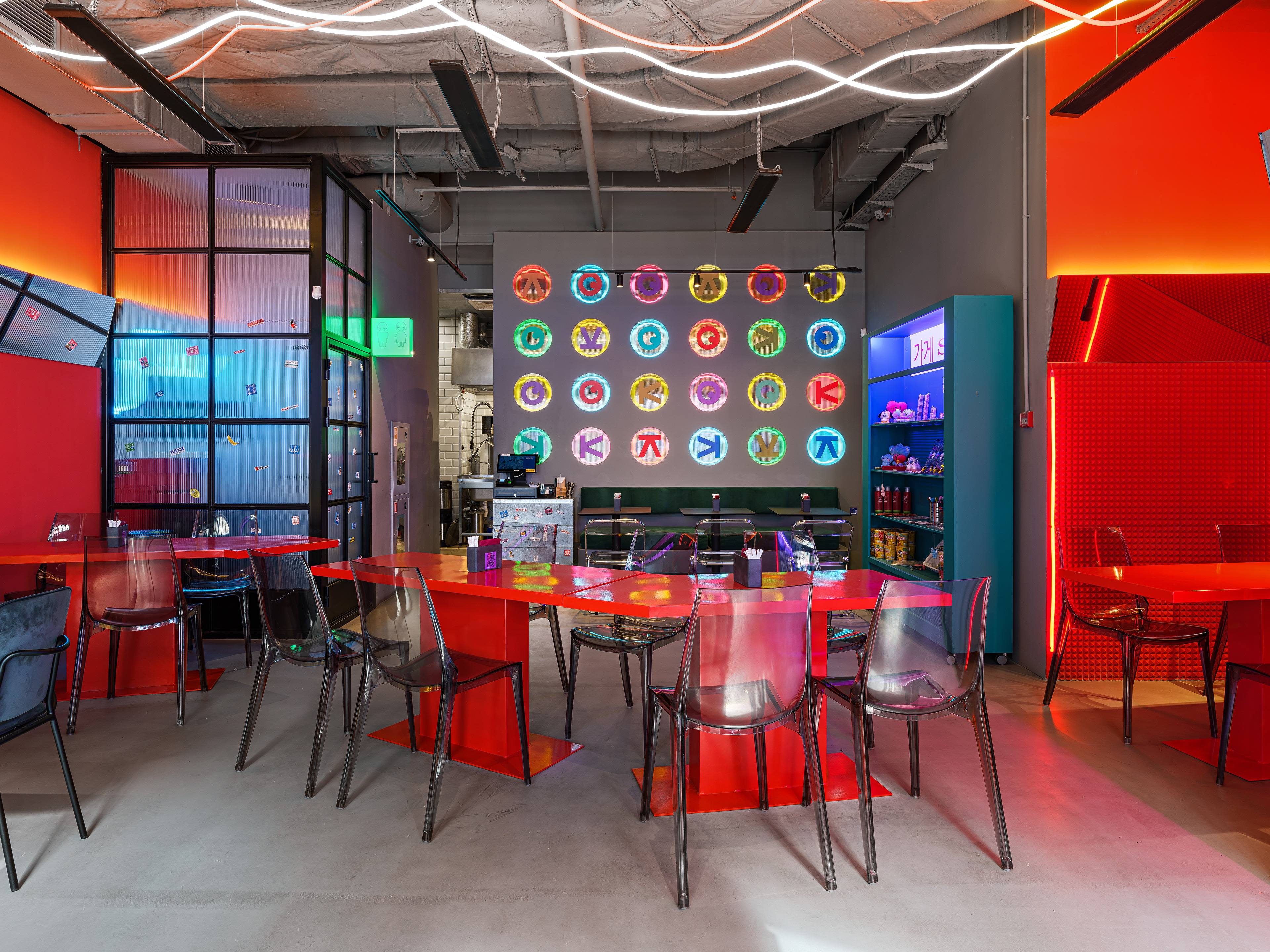 Интерьер наполнен множеством арт-объектов, каждый из которых вносит свой вклад в уникальность пространства. Объемный маскот бренда, люстра из пластиковых трубок, зона продажи мерча, выполненная в стиле вендинговых автоматов, светильники-микрофоны, стейшн администратора из оцинковки - каждый предмет здесь расскажет свою историю. Современная интерпретация бегущей строки, ставшей знаковым элементом для сети, усиливает общую атмосферу и отражает суть динамичного подхода Kook.