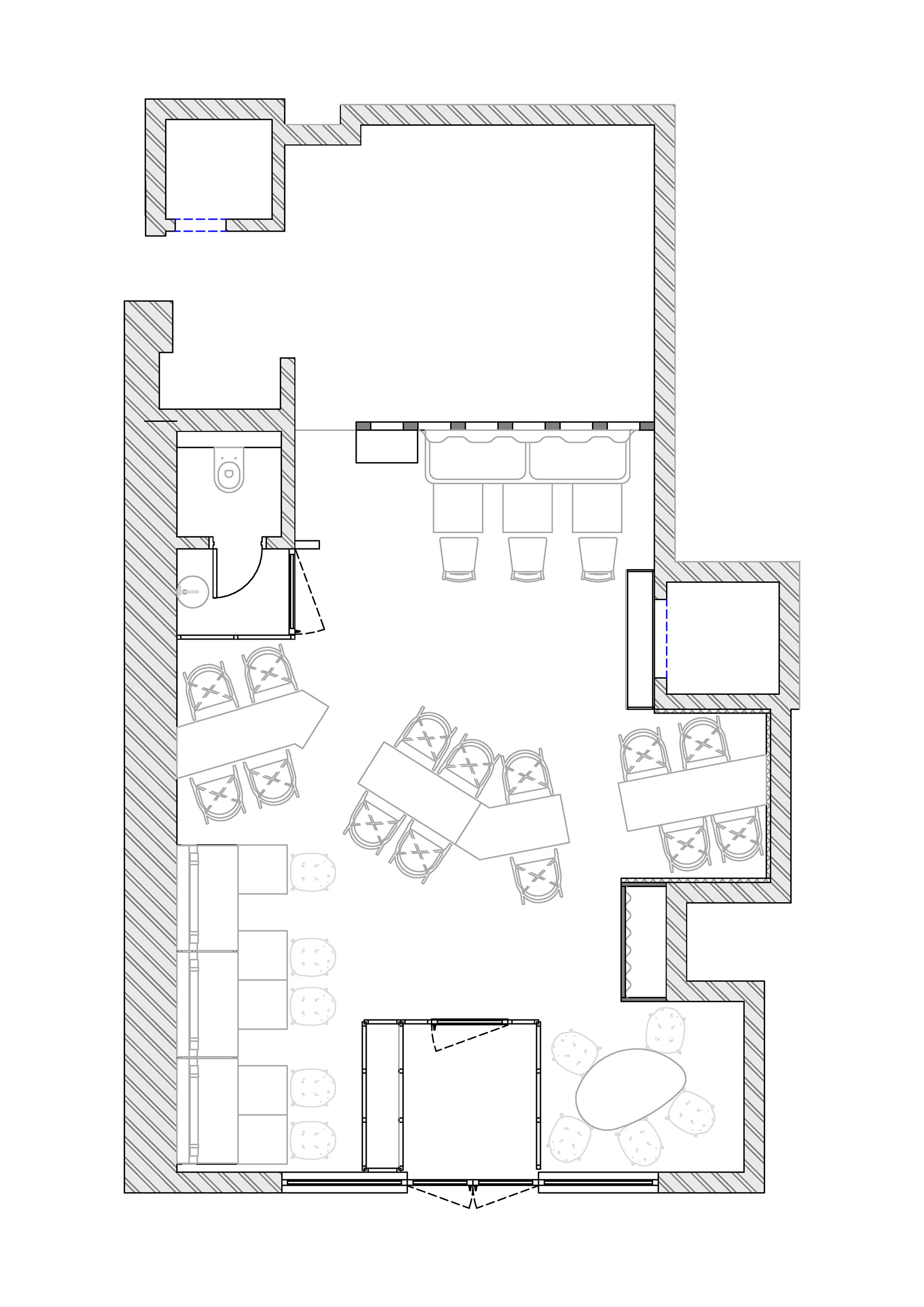 В помещении небольшой площади было необходимо разместить достаточное количество посадочных мест без ущерба для комфорта и эргономики. Зонирование мебелью и неоновыми подсветками разных цветов делят интерьер на три блока, формируя разные зоны в едином пространстве. Большие арочные окна и высокие потолки оставляют много воздуха в компактном помещении. Мы усилили этот эффект, оставив потолки открытыми и добавив много подсветок и зеркал.