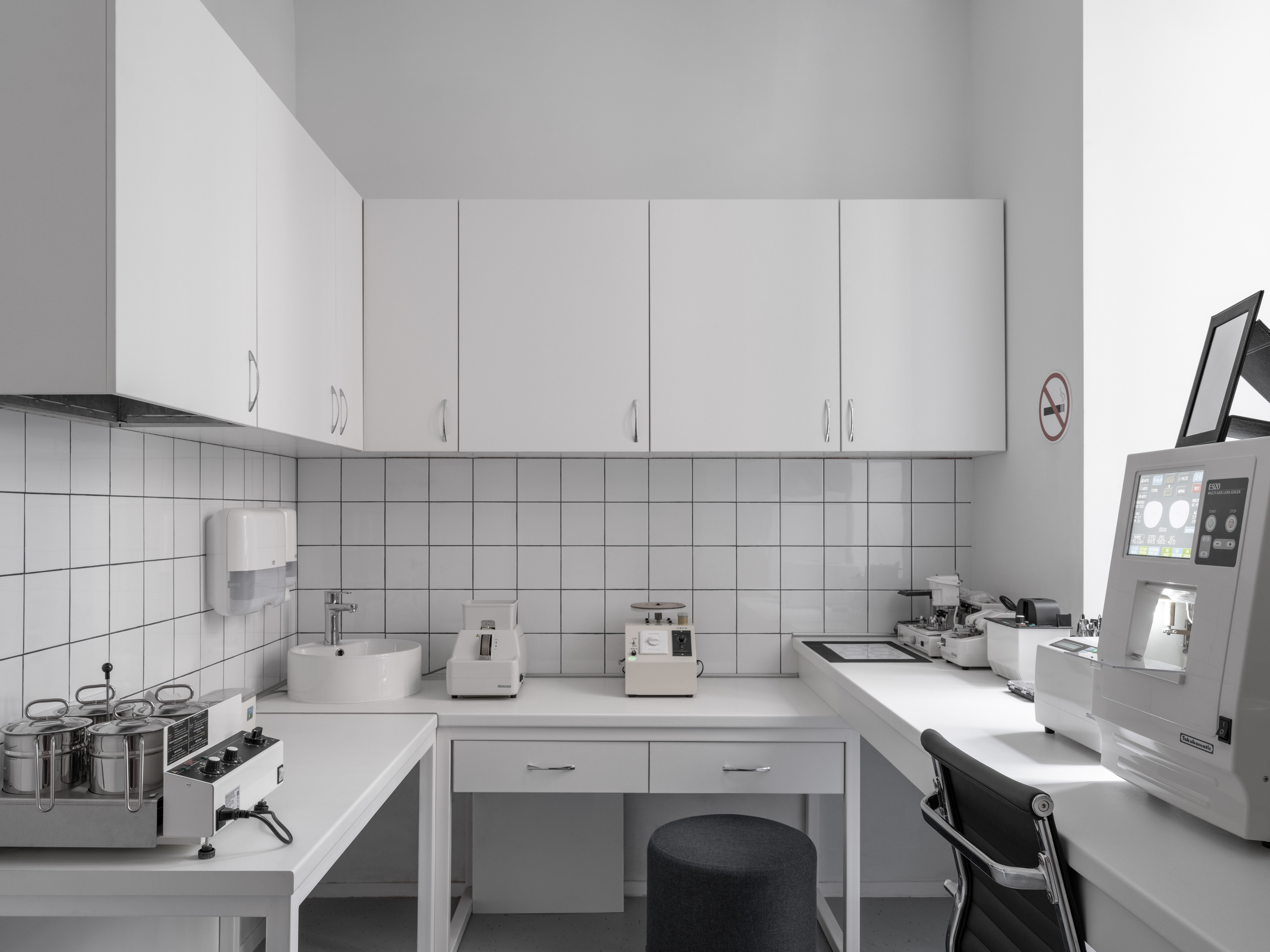 Кроме экспозиции в магазине расположены кабинеты оптометрии и мастерская. Светлые и максимально чистые, стерильные помещения в то же время подчиняются общей концепции пространства и визуально связываются с основными залами.