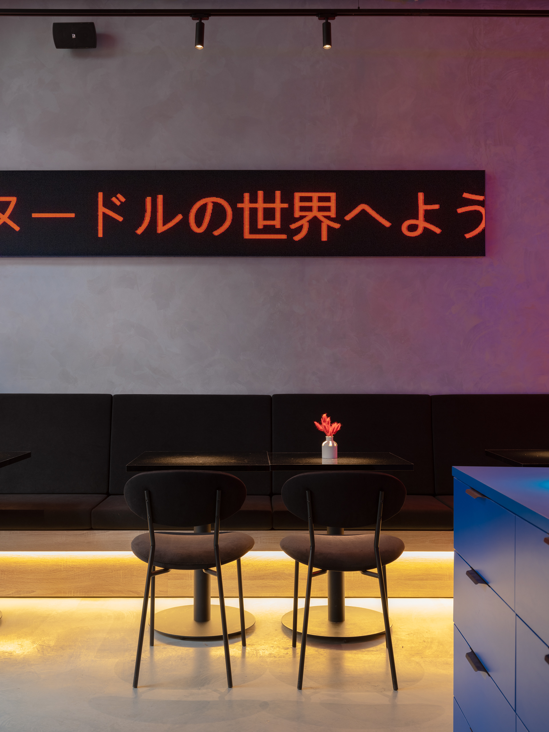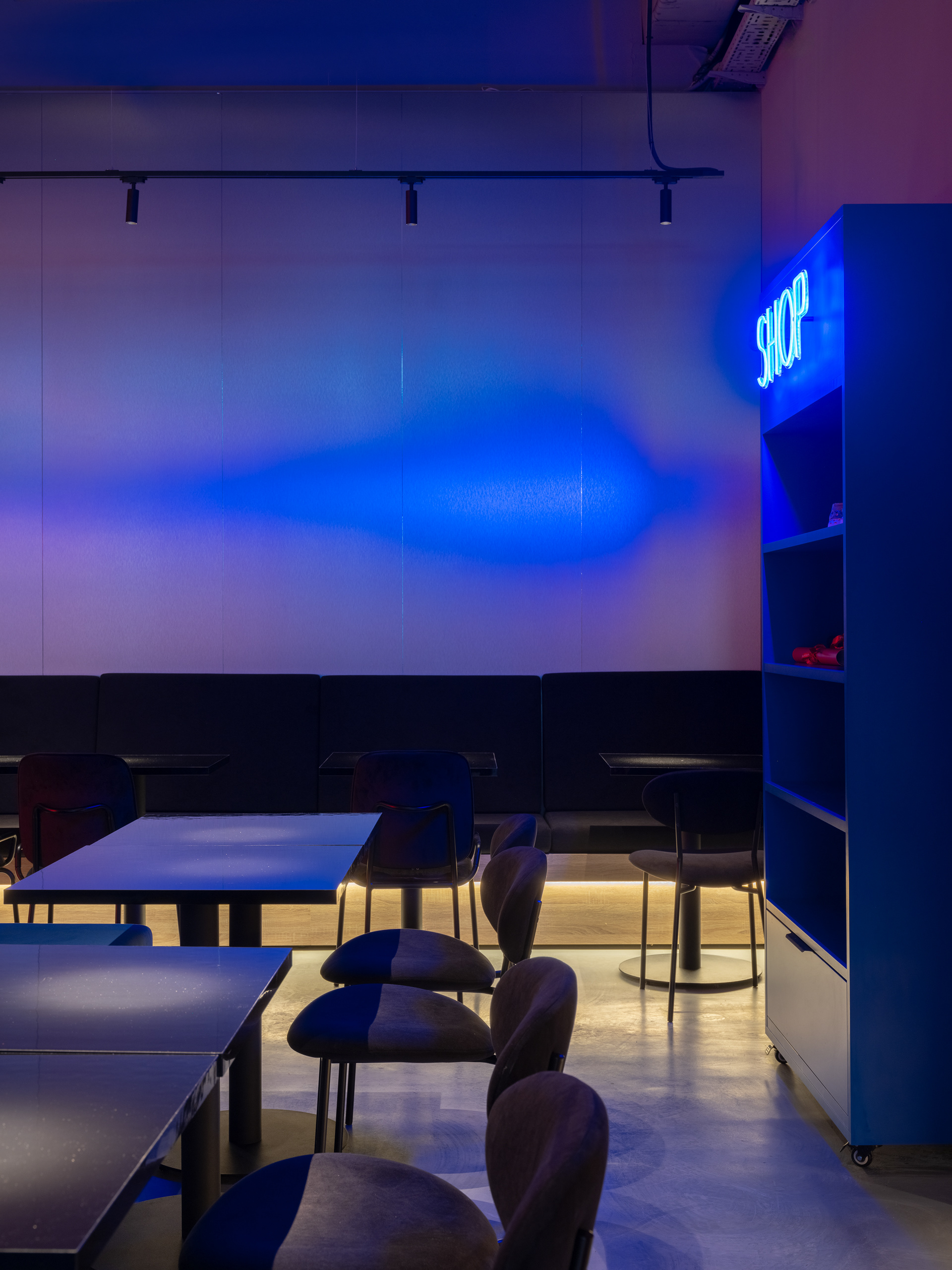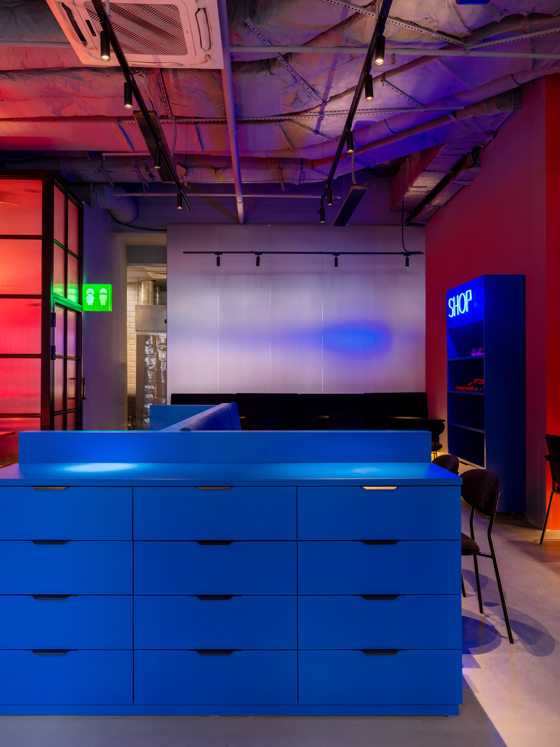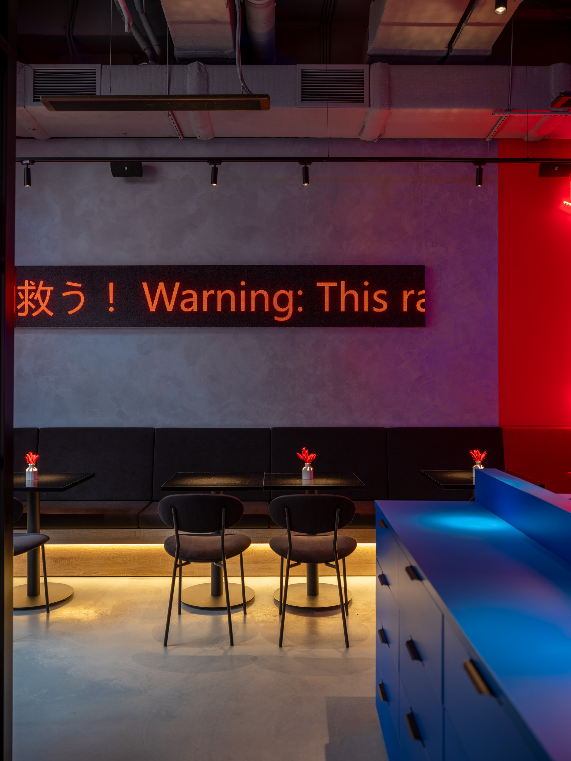 Освещение играет ключевую роль в создании атмосферы. Неоновые вывески, цифровые бегущие строки и направленный свет подчеркивают урбанистичный стиль заведения. Графика и текстовые вставки на стенах дополняют концепцию и делают интерьер ещё более выразительным.