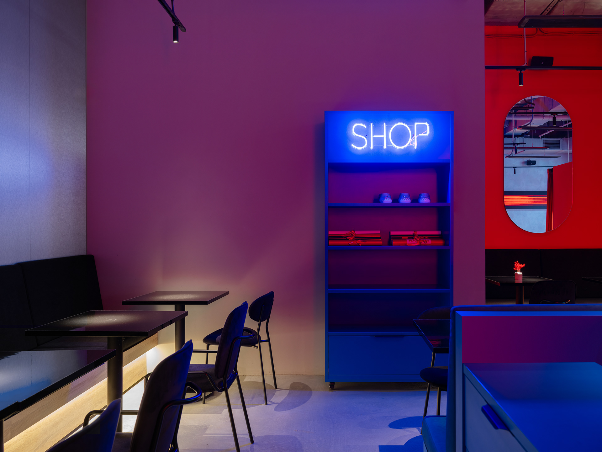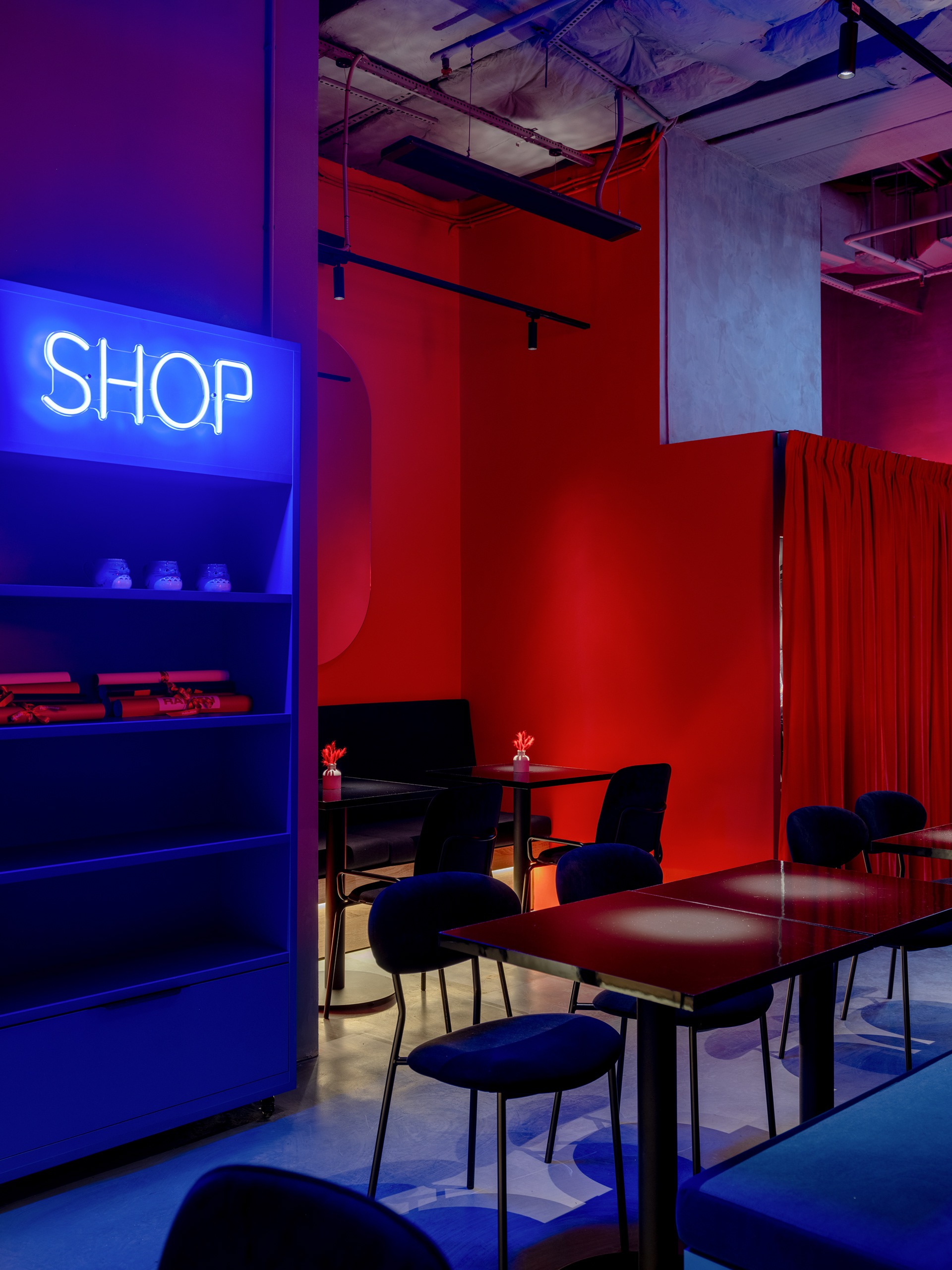 Интерьер построен на смелом сочетании ярко-красного и насыщенного синего цветов. Эта контрастная палитра формирует динамичное и запоминающееся пространство: красные стены, подсветка и текстиль придают интерьеру тепло и насыщенность, а синие акценты в мебели и декоре добавляют глубины и визуального баланса.